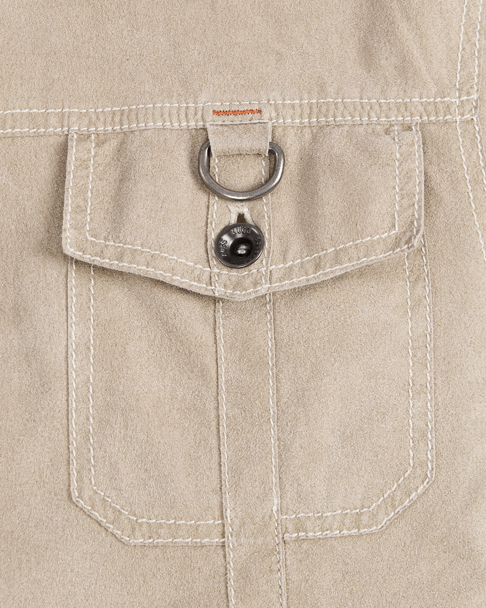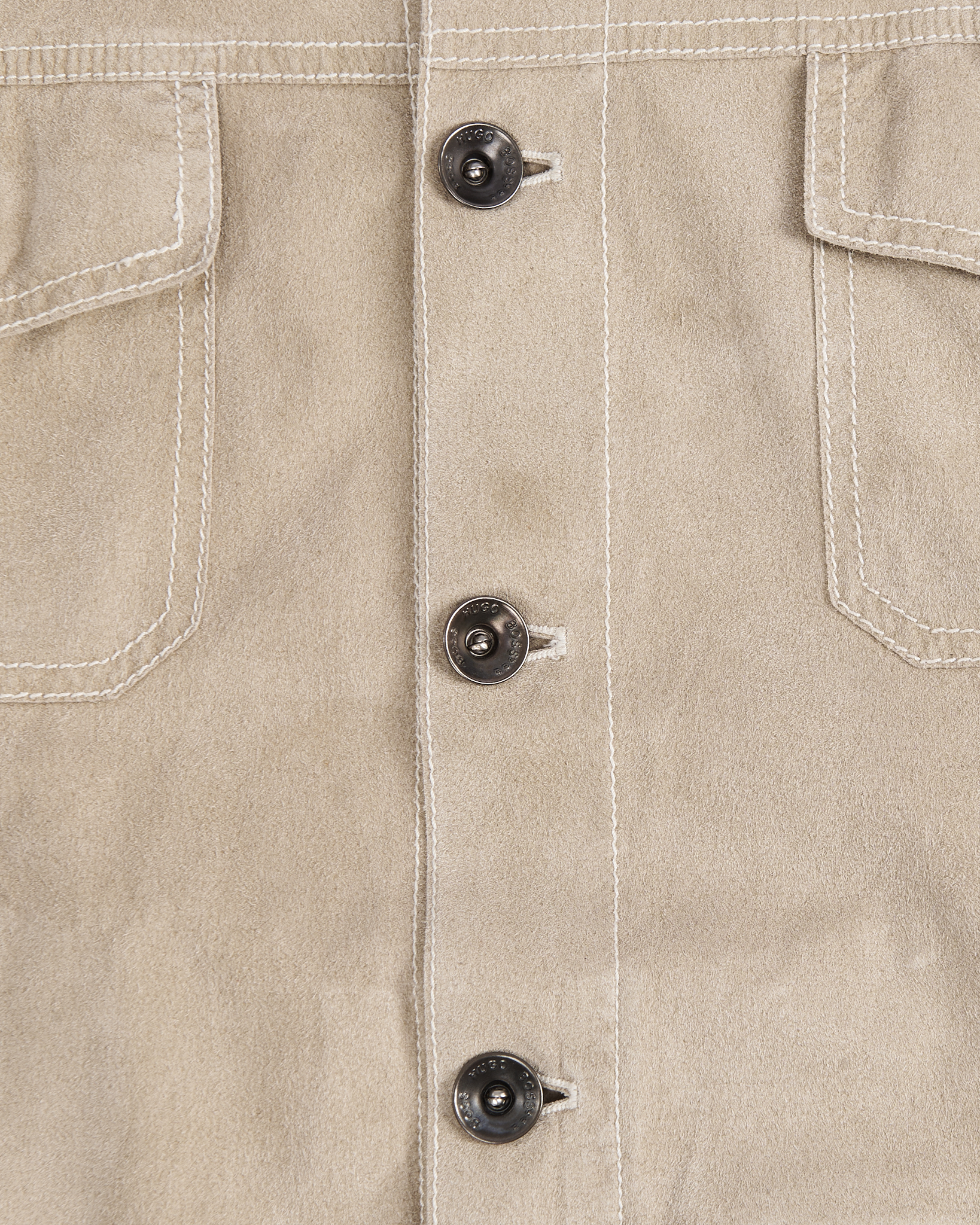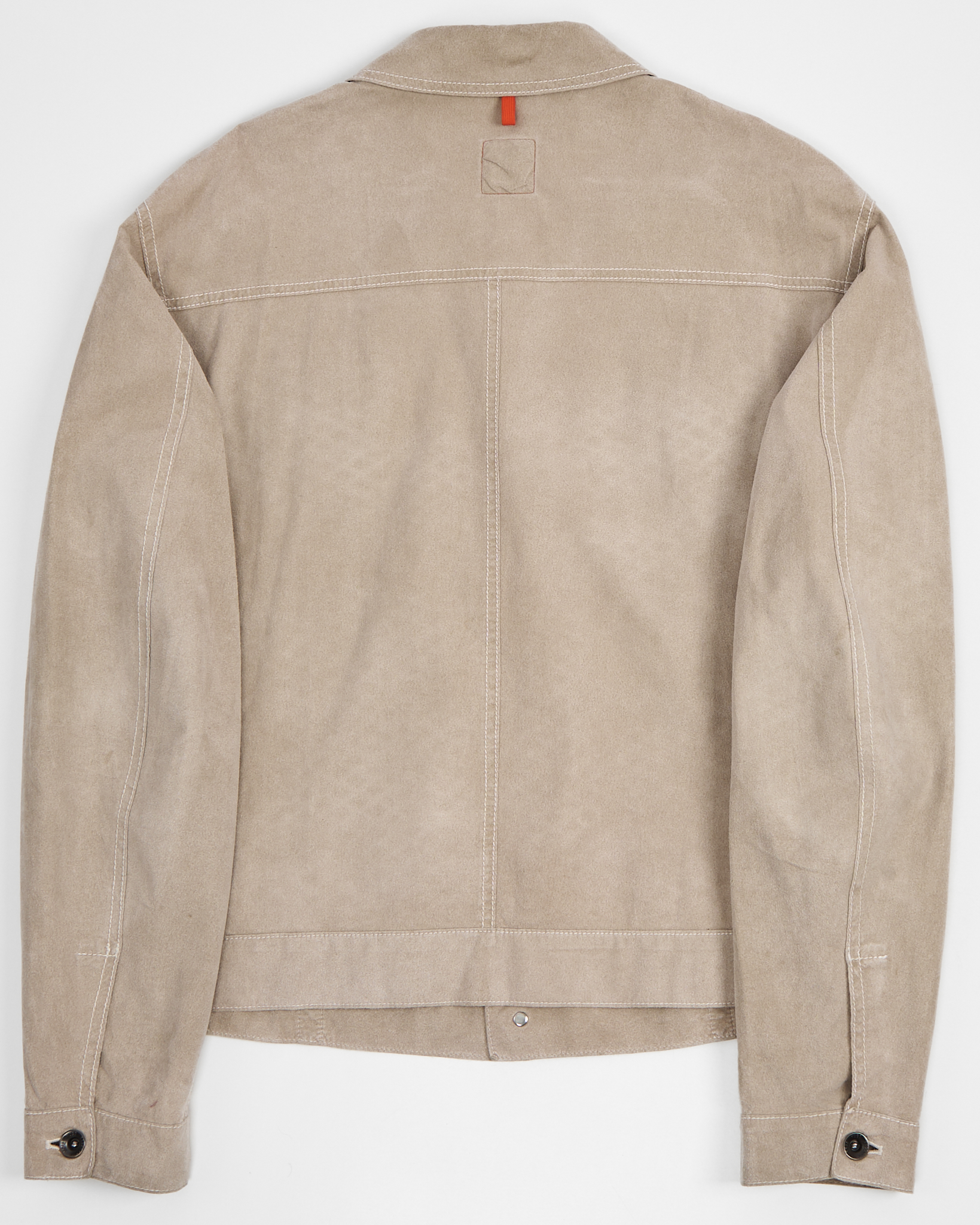 Винтажная куртка Hugo Boss. Куртка из натуральной замши светлого бежевого оттенка с контрастной прострочкой и фирменной фурнитурой. Посадка прямая и собранная, длина комфортная. Функциональные нагрудные карманы.