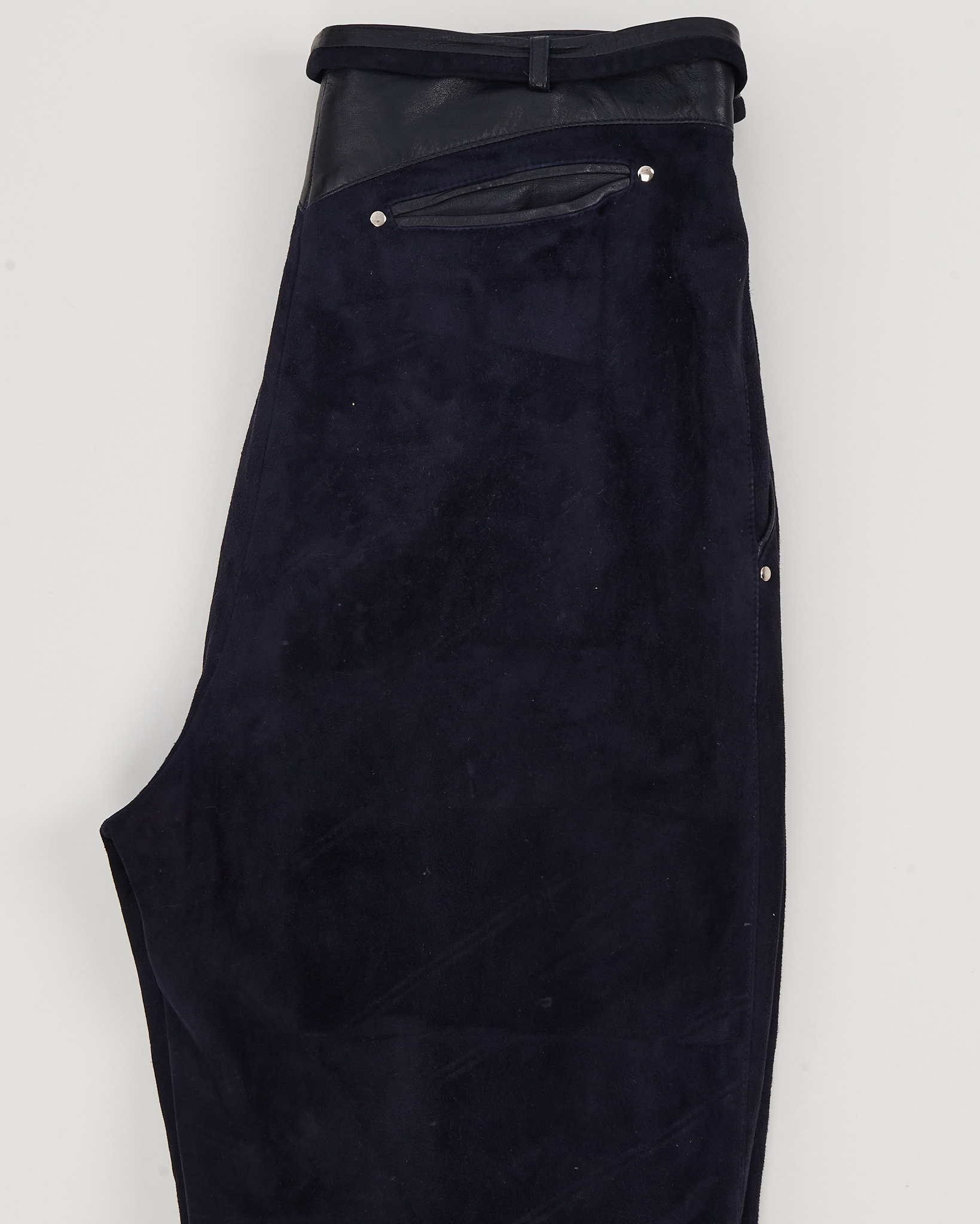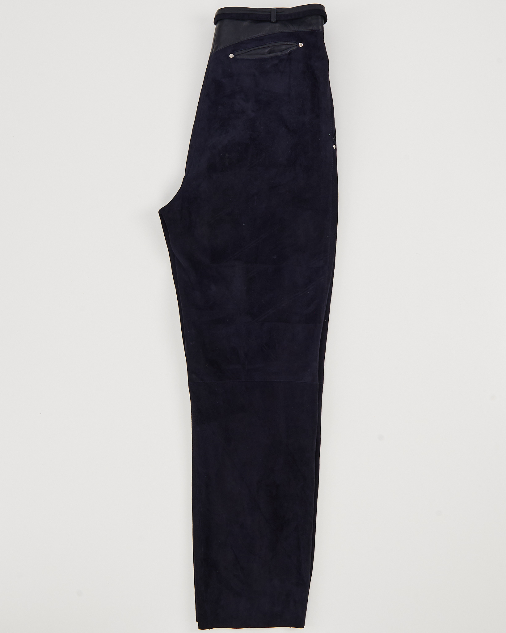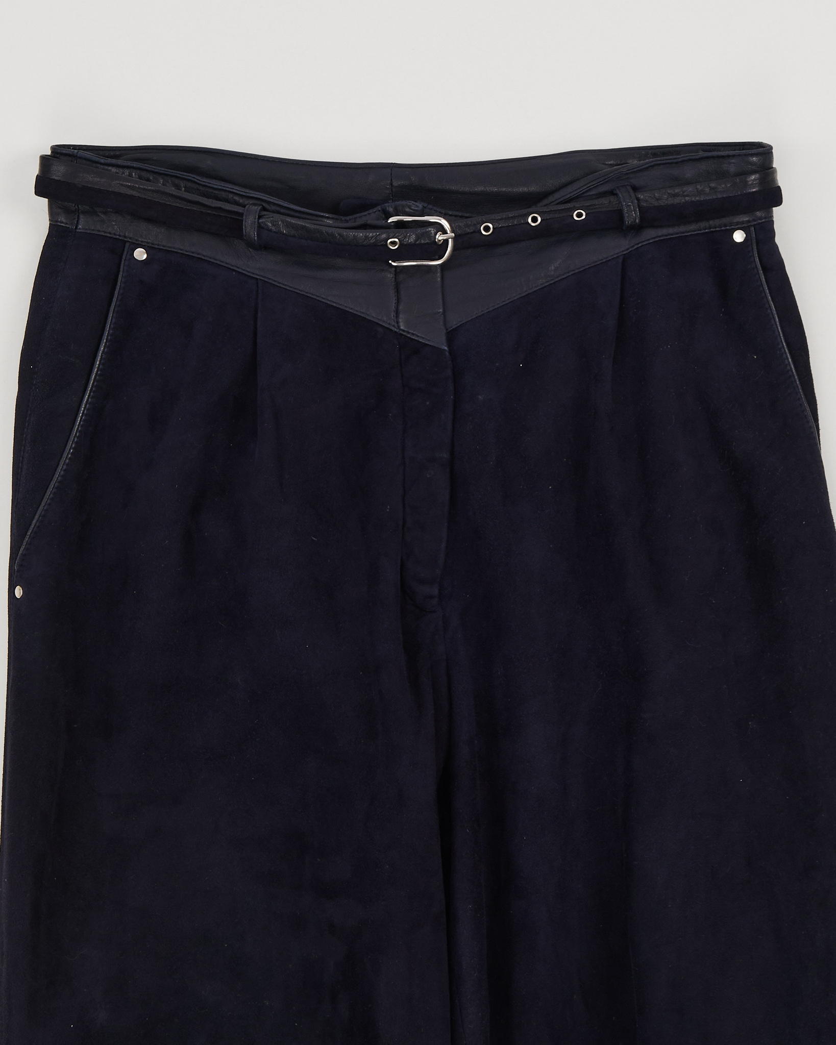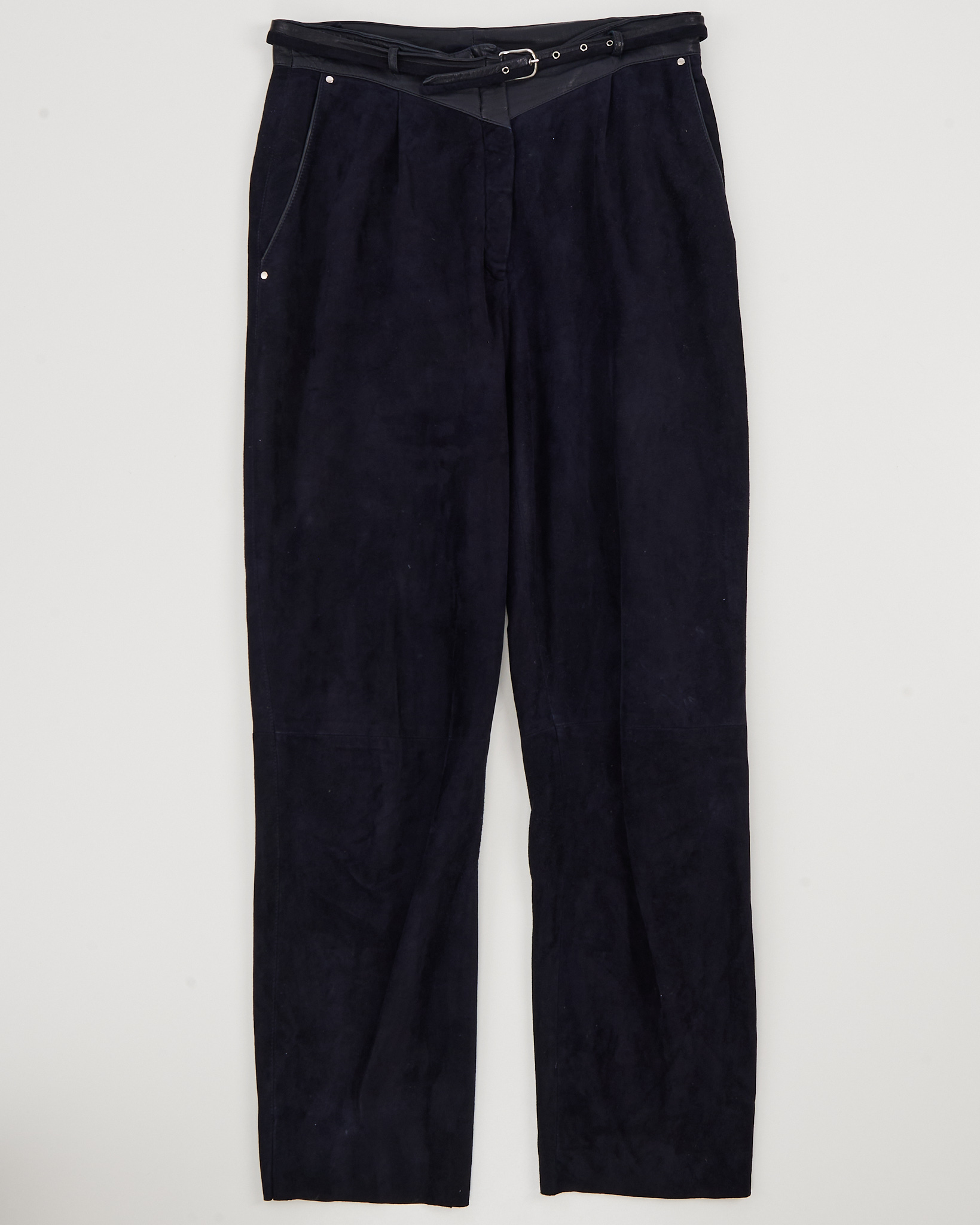 Брюки la douce by Edith Sonanini из мягкой натуральной замши глубокого тёмно-синего оттенка. Свободная посадка, удобная застежка на молнию и складки у пояса. Модель дополнена кожаным поясом с пряжкой и аккуратными карманами.