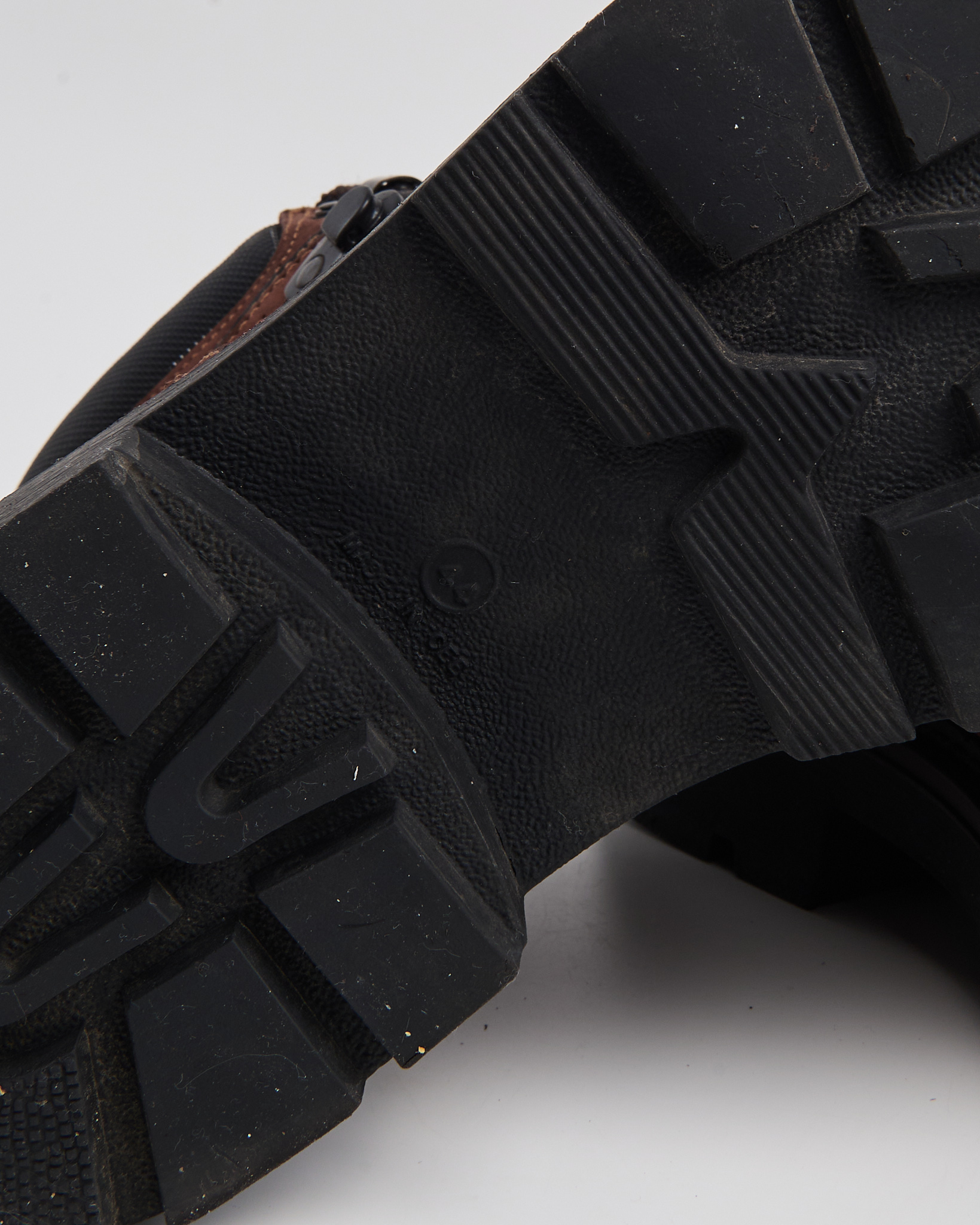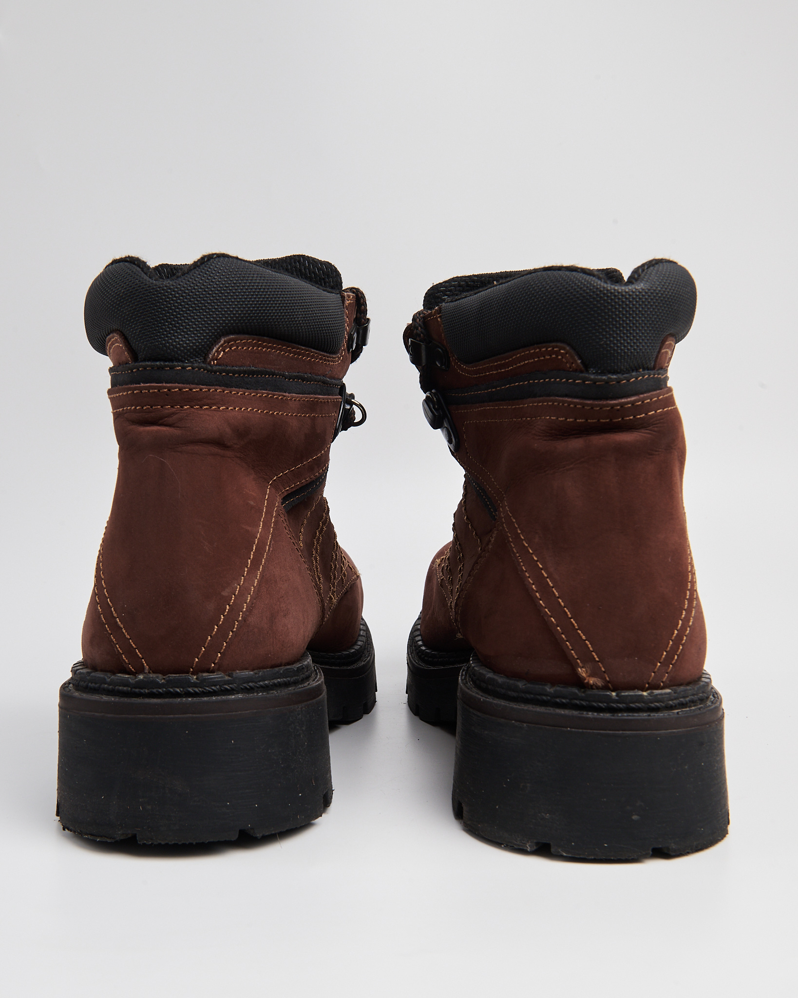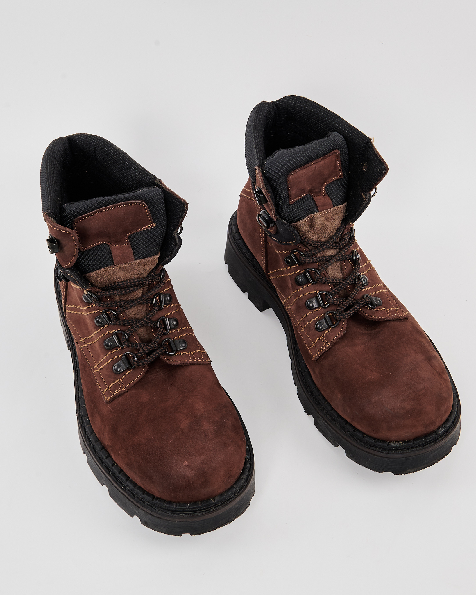 Замшевые трекинговые ботинки из плотной натуральной замши насыщенного коричневого оттенка. Посадка стабильная за счёт высокой шнуровки, мягкого воротника и плотной фиксации голеностопа. Толстая рельефная подошва, металлическая фурнитура и контрастная прострочка.