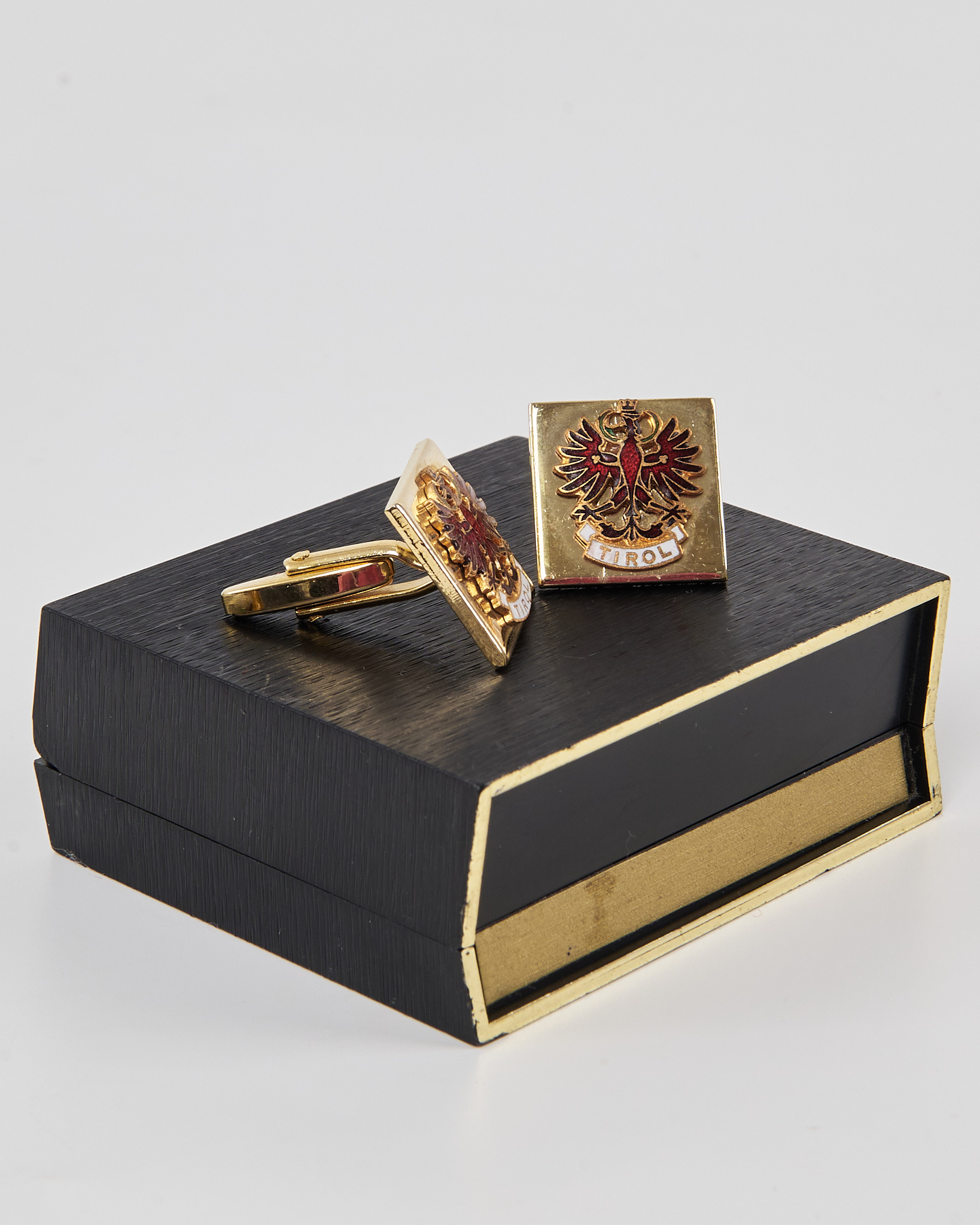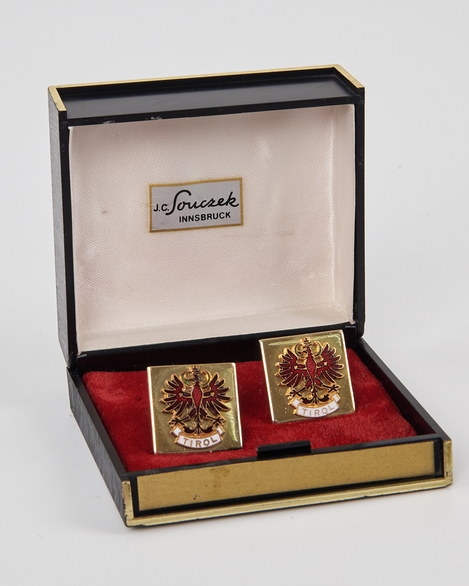 Запонки J.C. Soucek Innsbruck «Tirol» в оригинальном футляре. Золотистый металл с рельефной эмалью в виде герба орла.