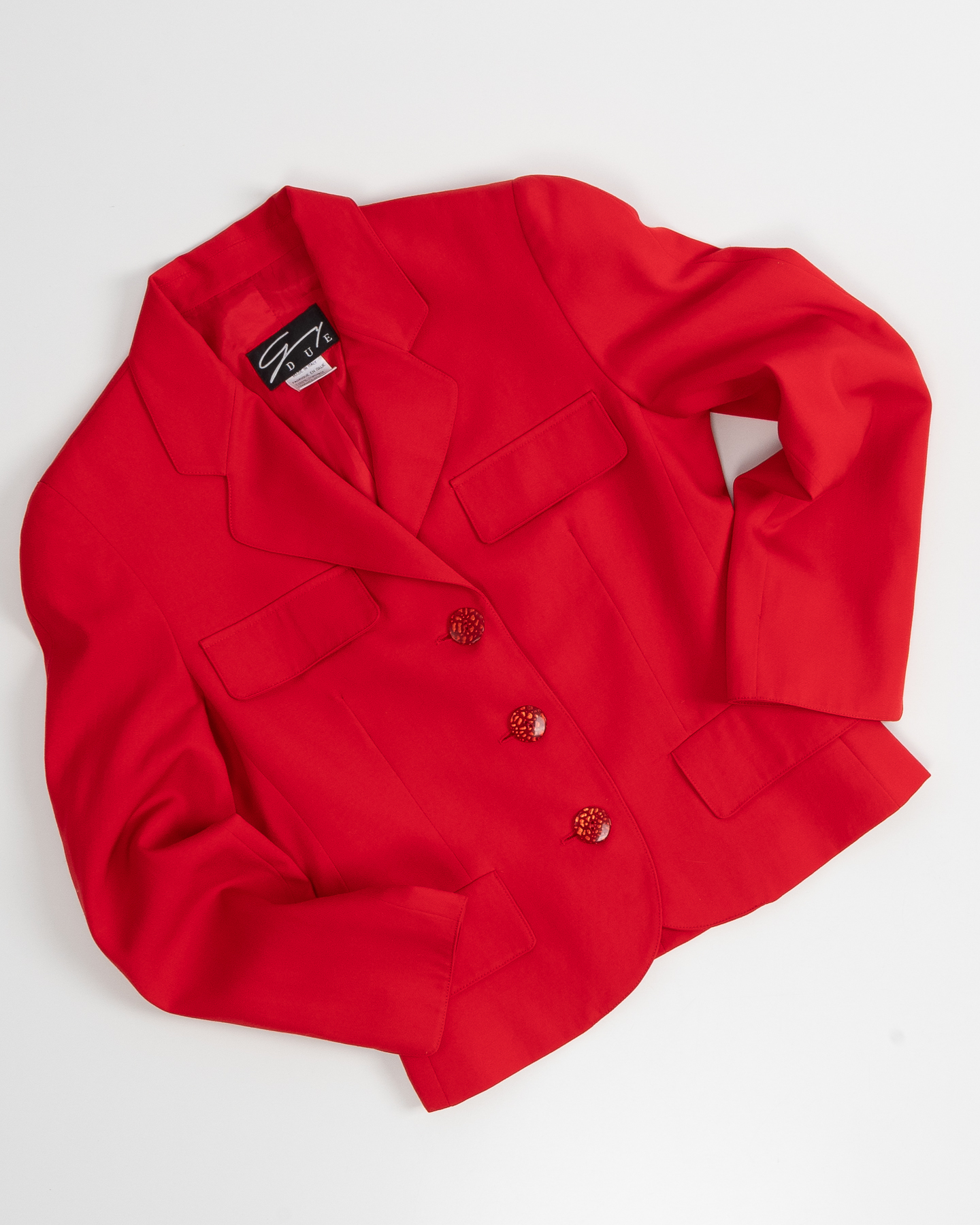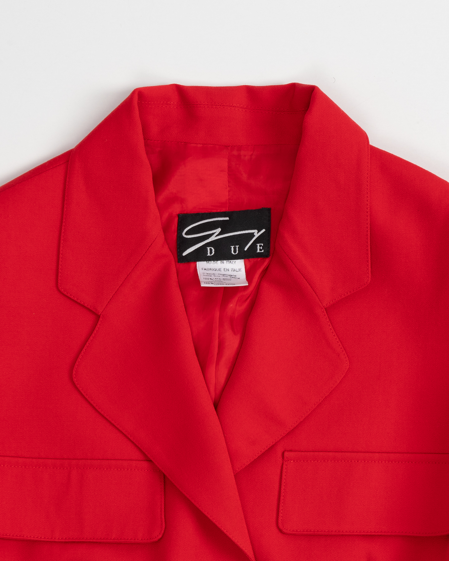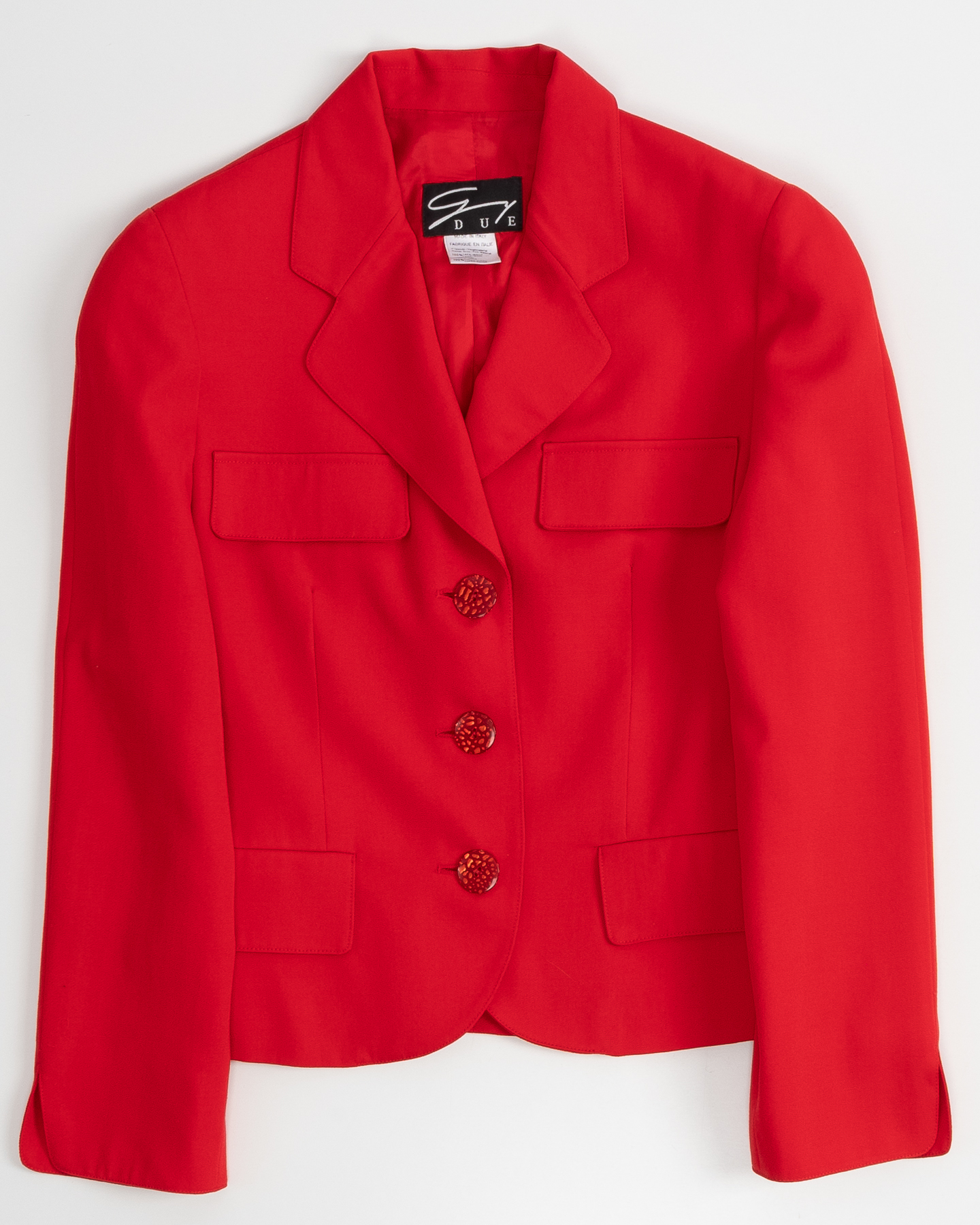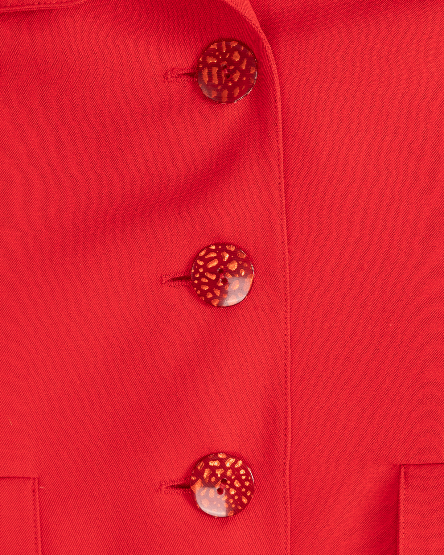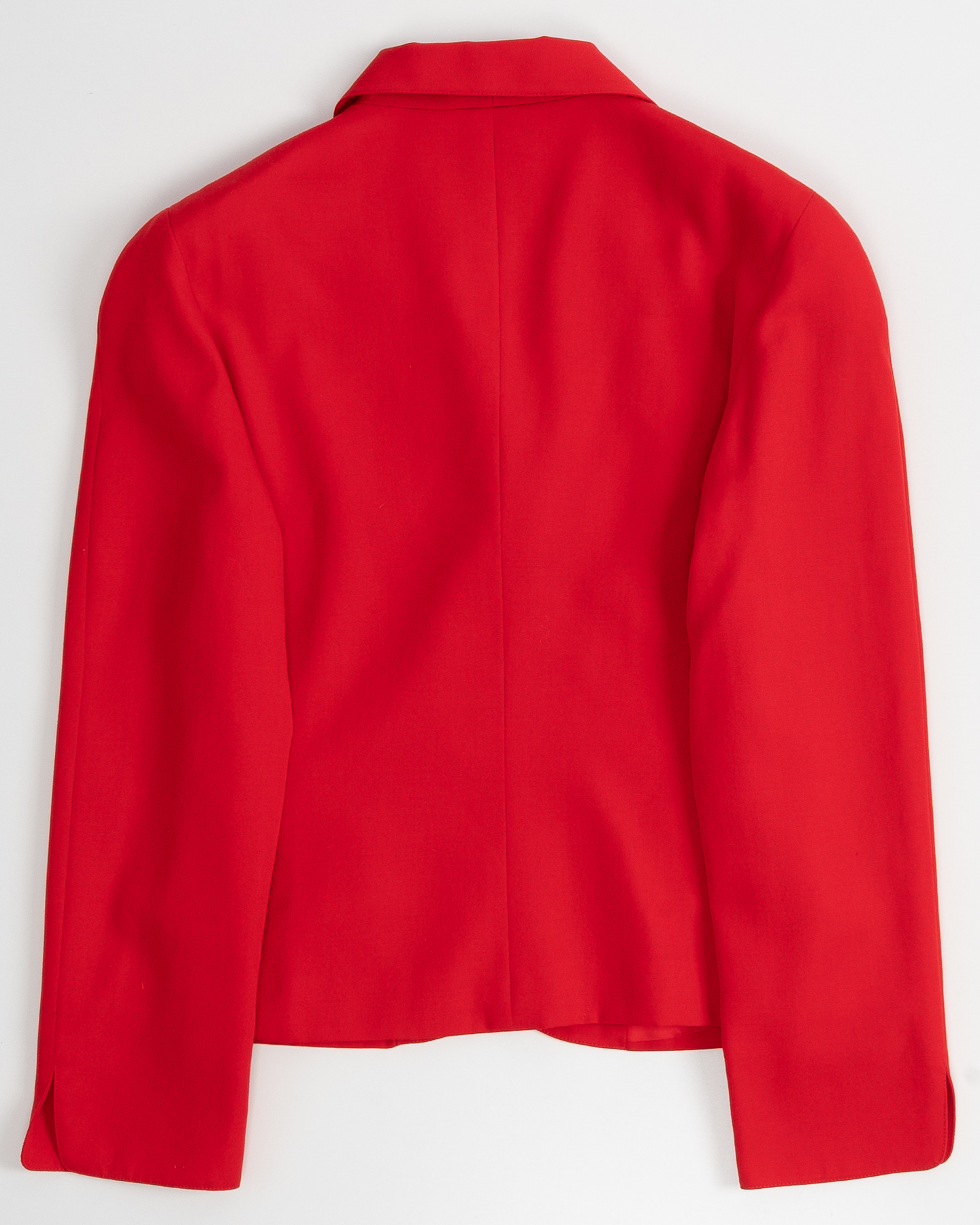Приталенный крой с акцентом на линии плеч. Четыре кармана-обманки с клапанами создают стильный акцент. Жакет украшен крупными пуговицами в тон. Идеальное состояние, без следов носки.
