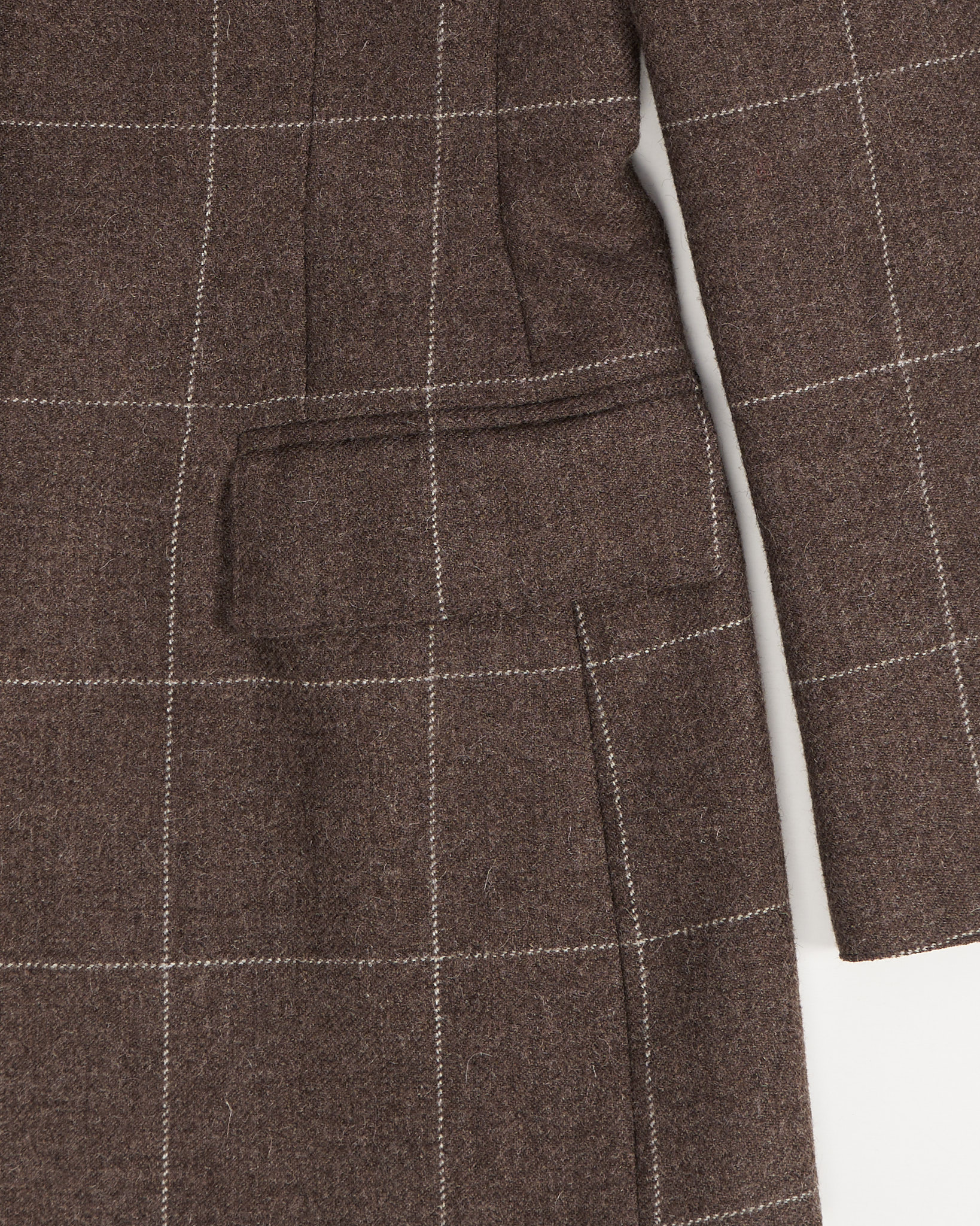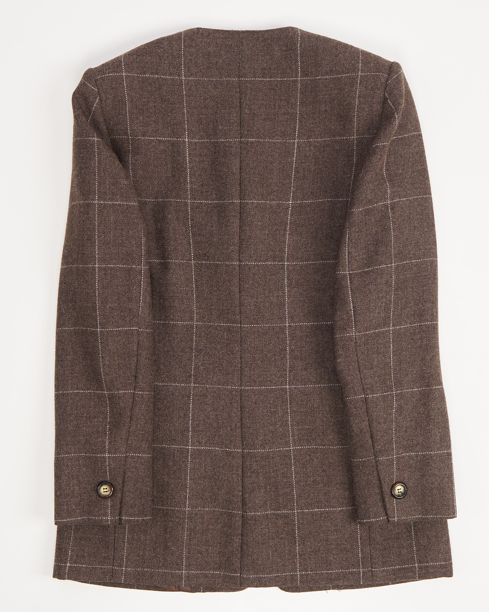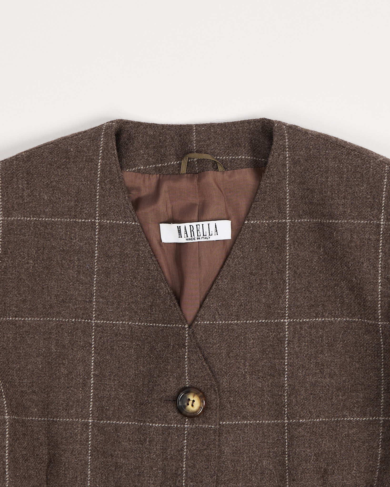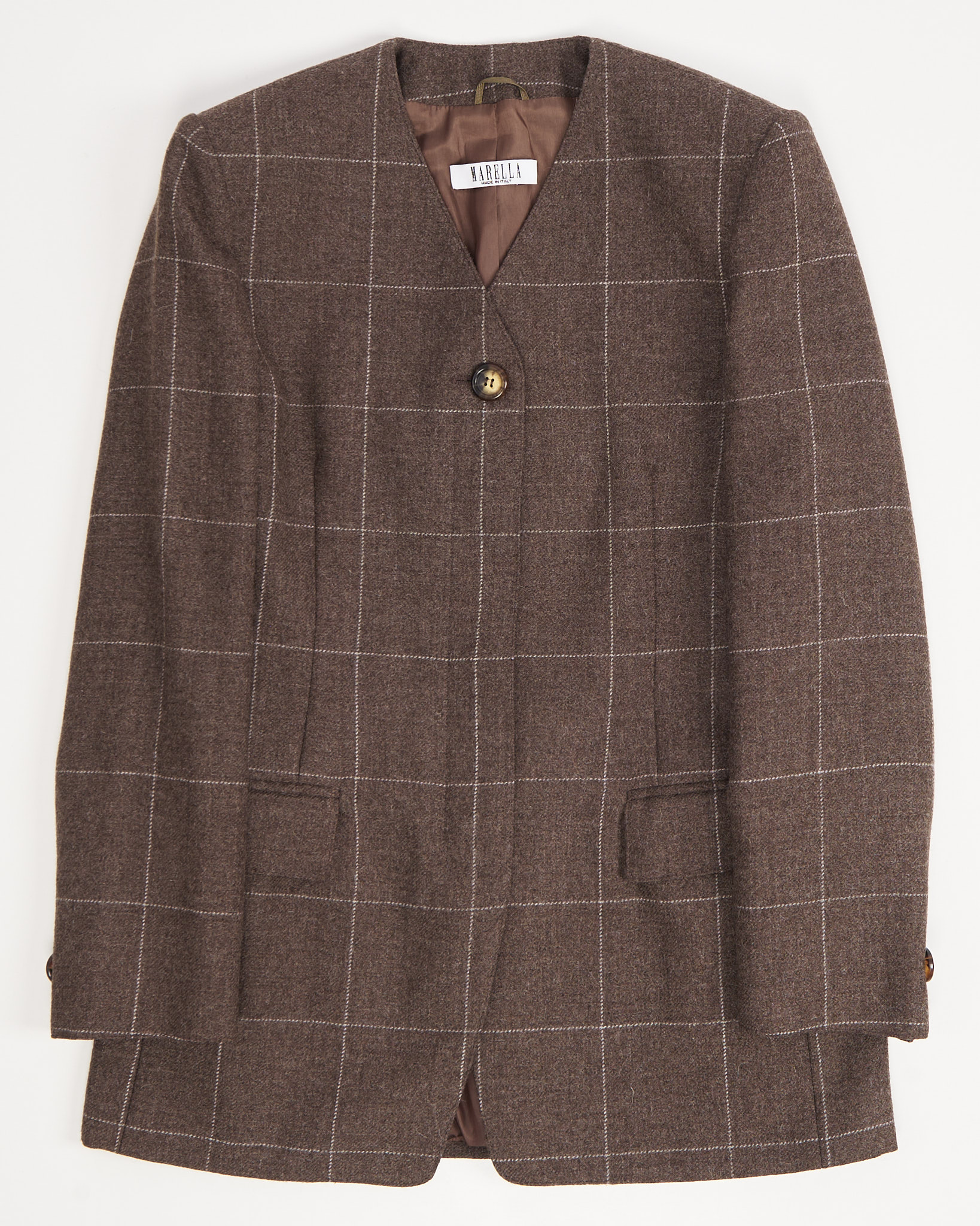 Жакет приталенного силуэта, с V-образным вырезом. Дополнен двумя карманами, не распоротыми. Застежка на пуговицы янтарно-коричневого оттенка. Сделан в Италии