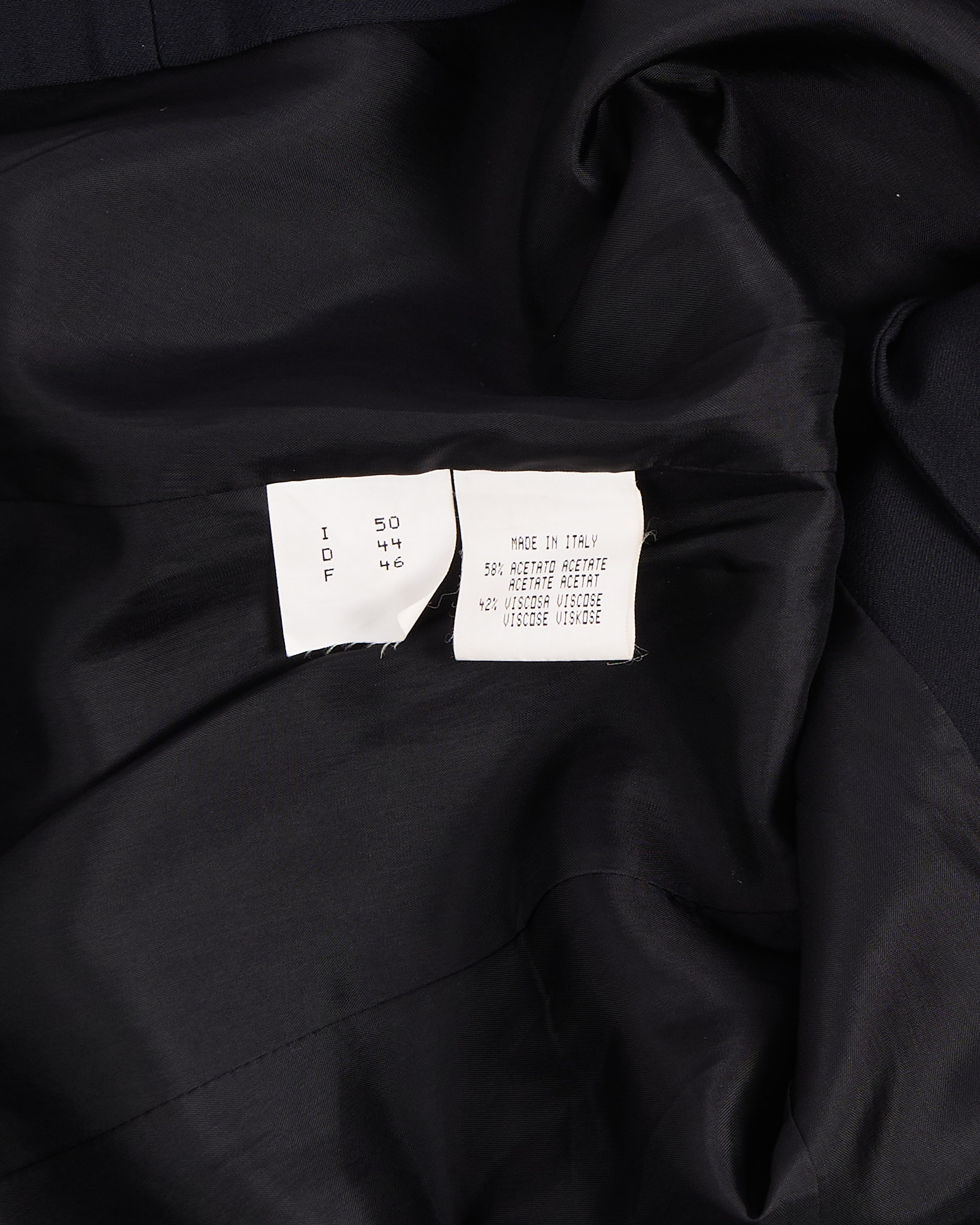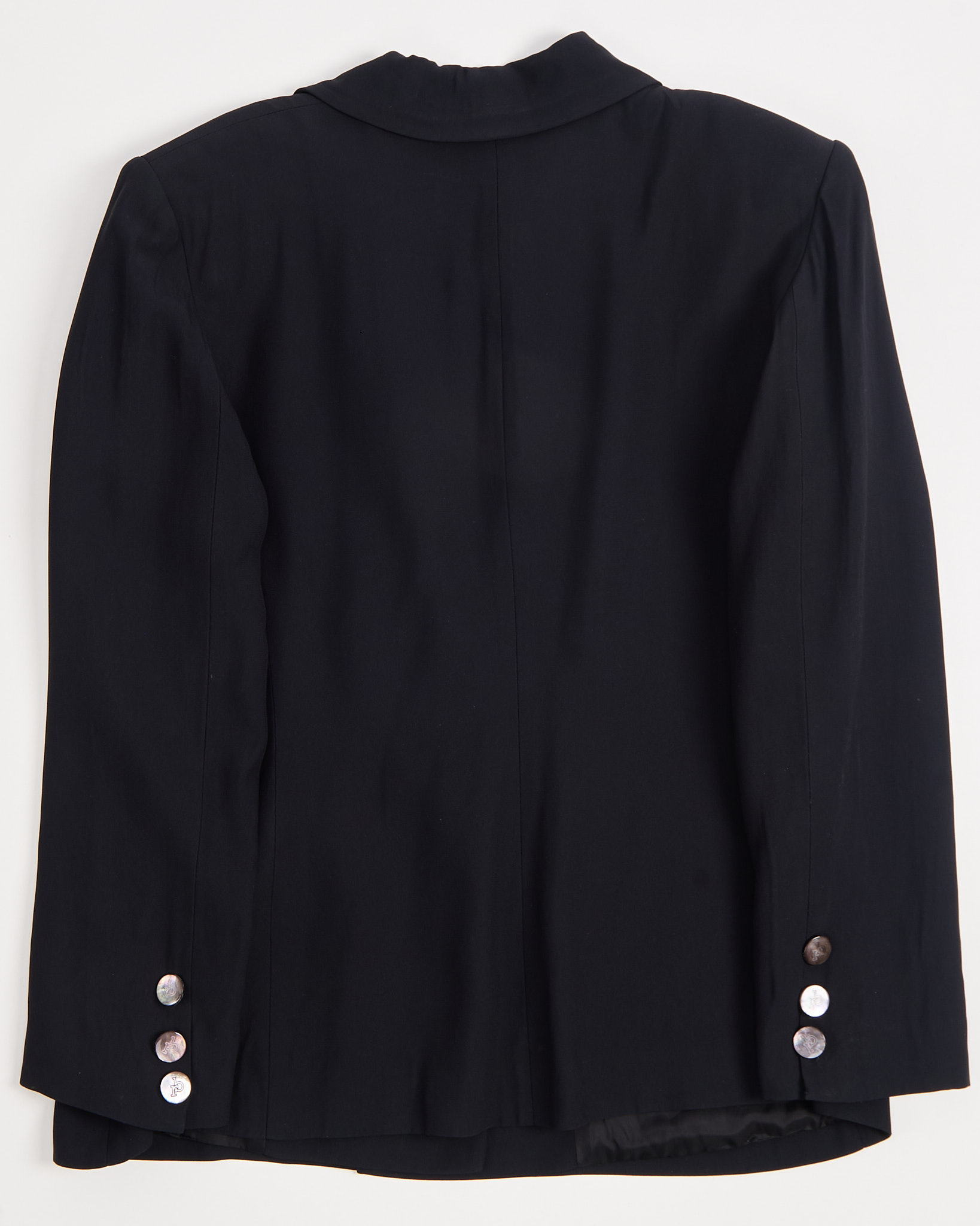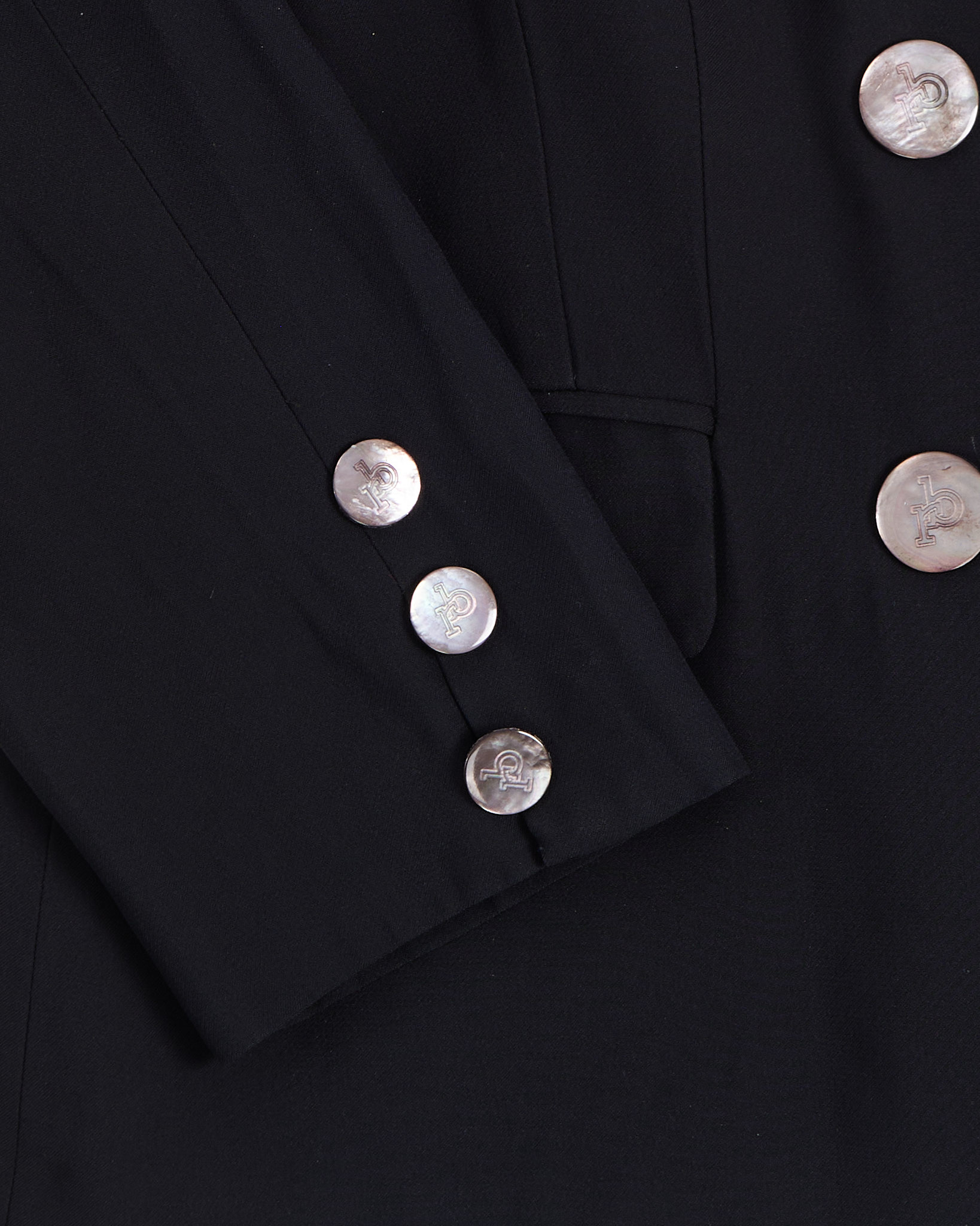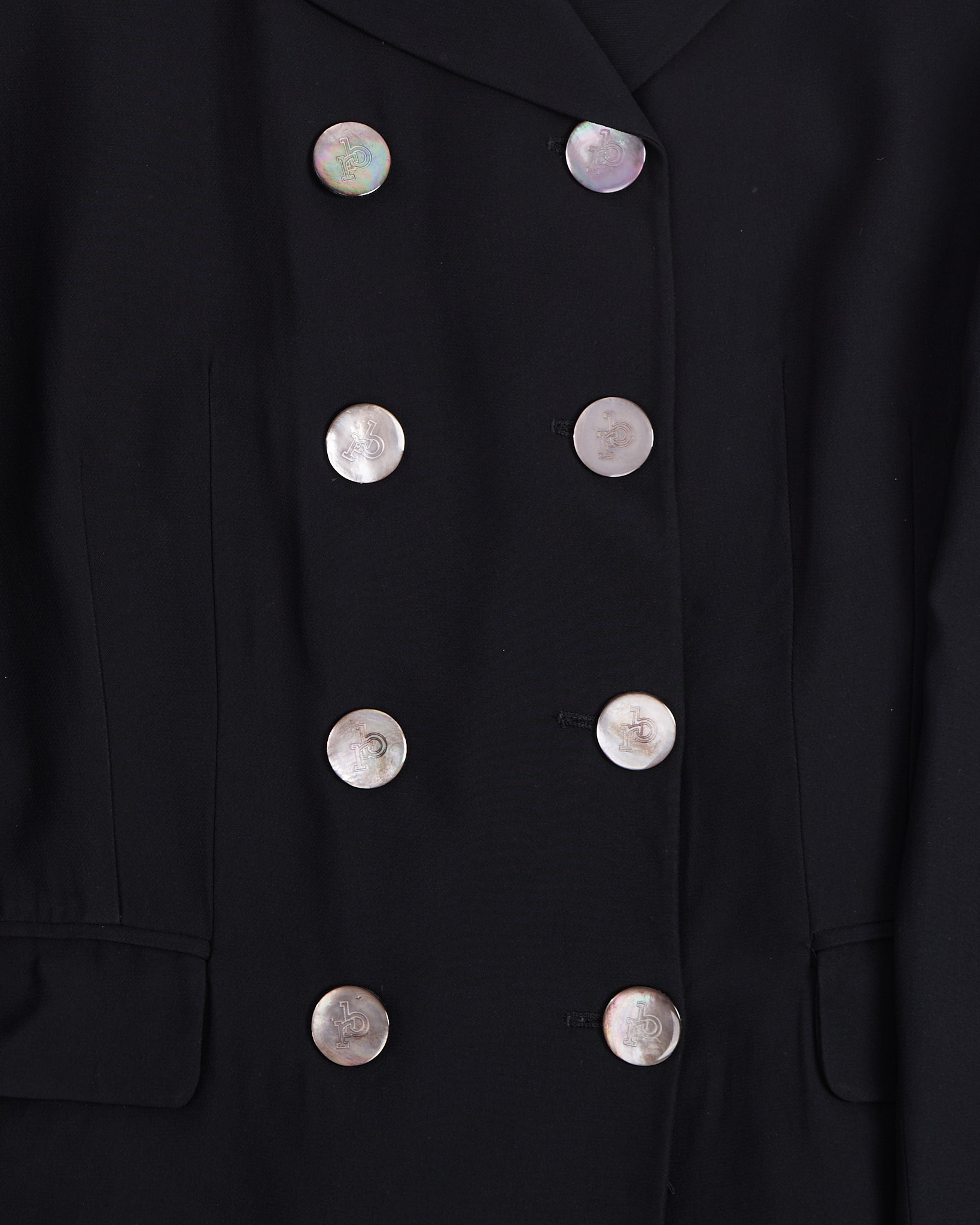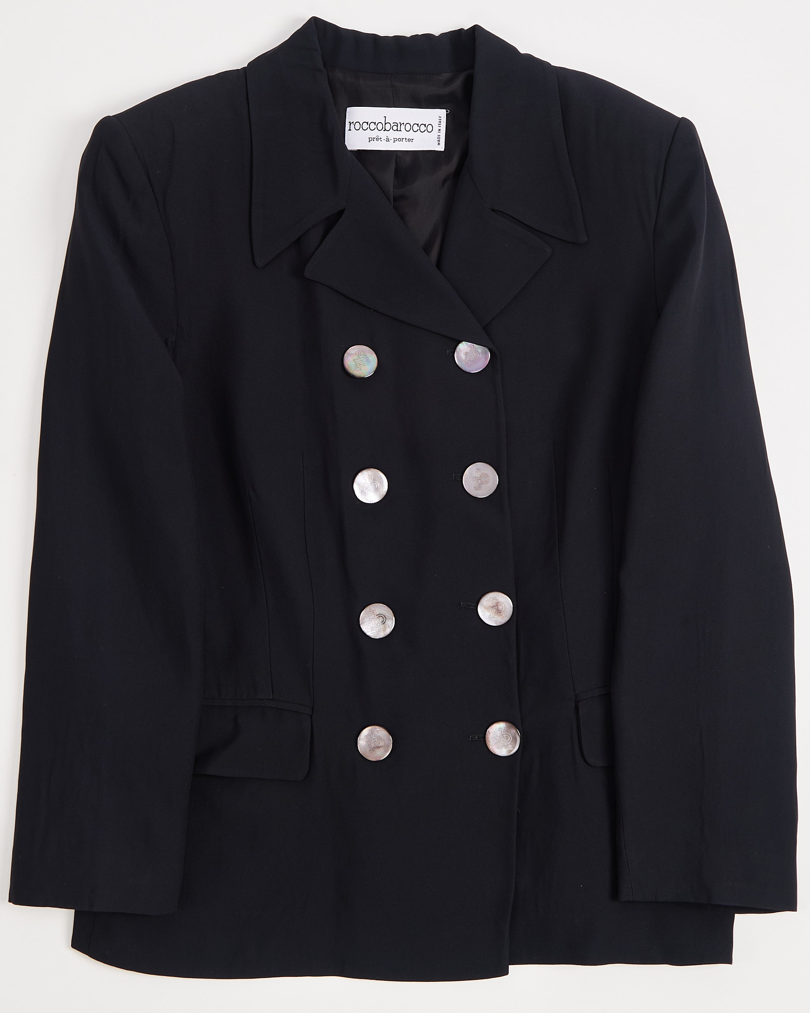 Стильный двубортный жакет с брендированными пуговицами из натурального перламутра от популярного в 90-е итальянского бренда . Силуэт слегла приталенный, есть два наружных кармана. Жакет легкий, но держит форму.