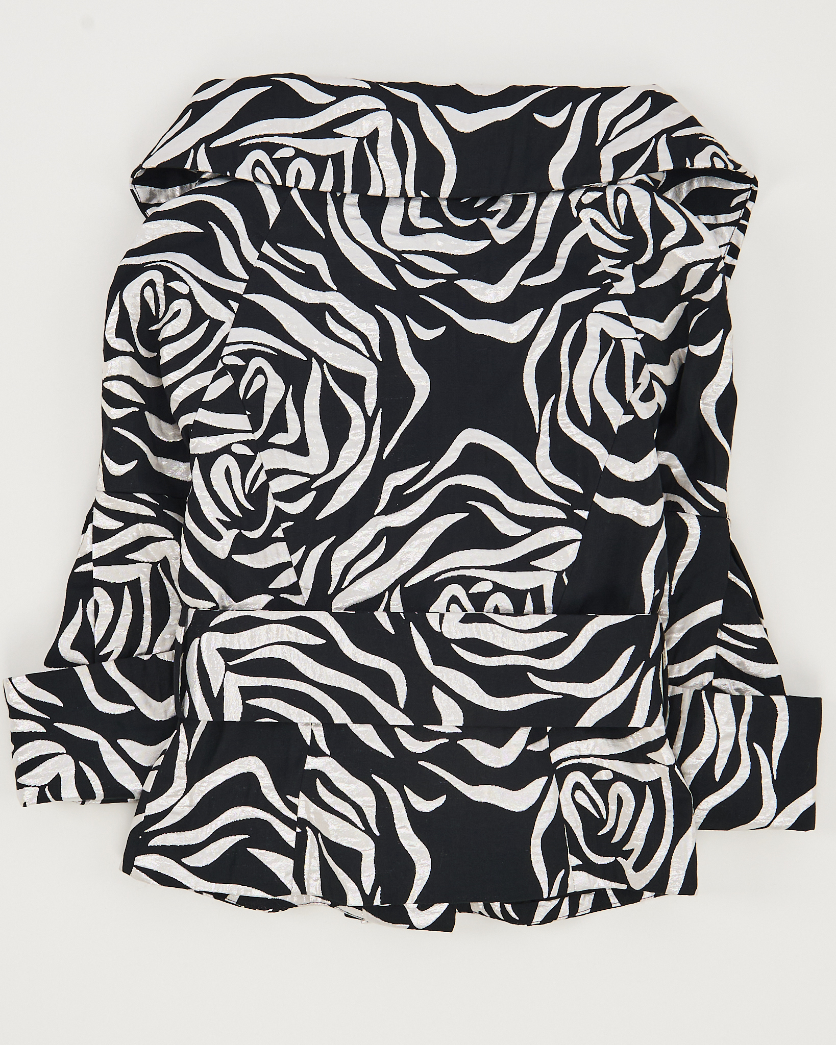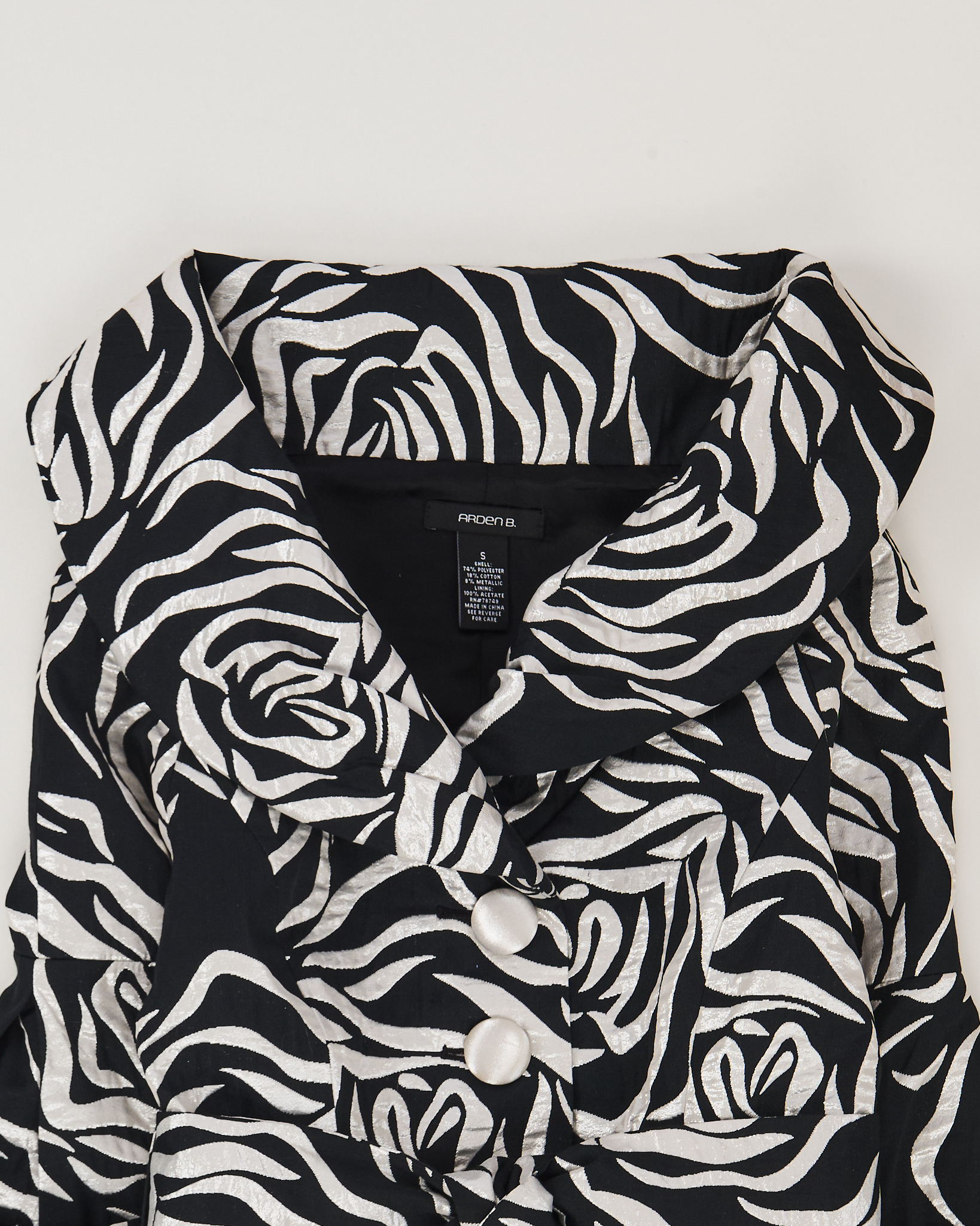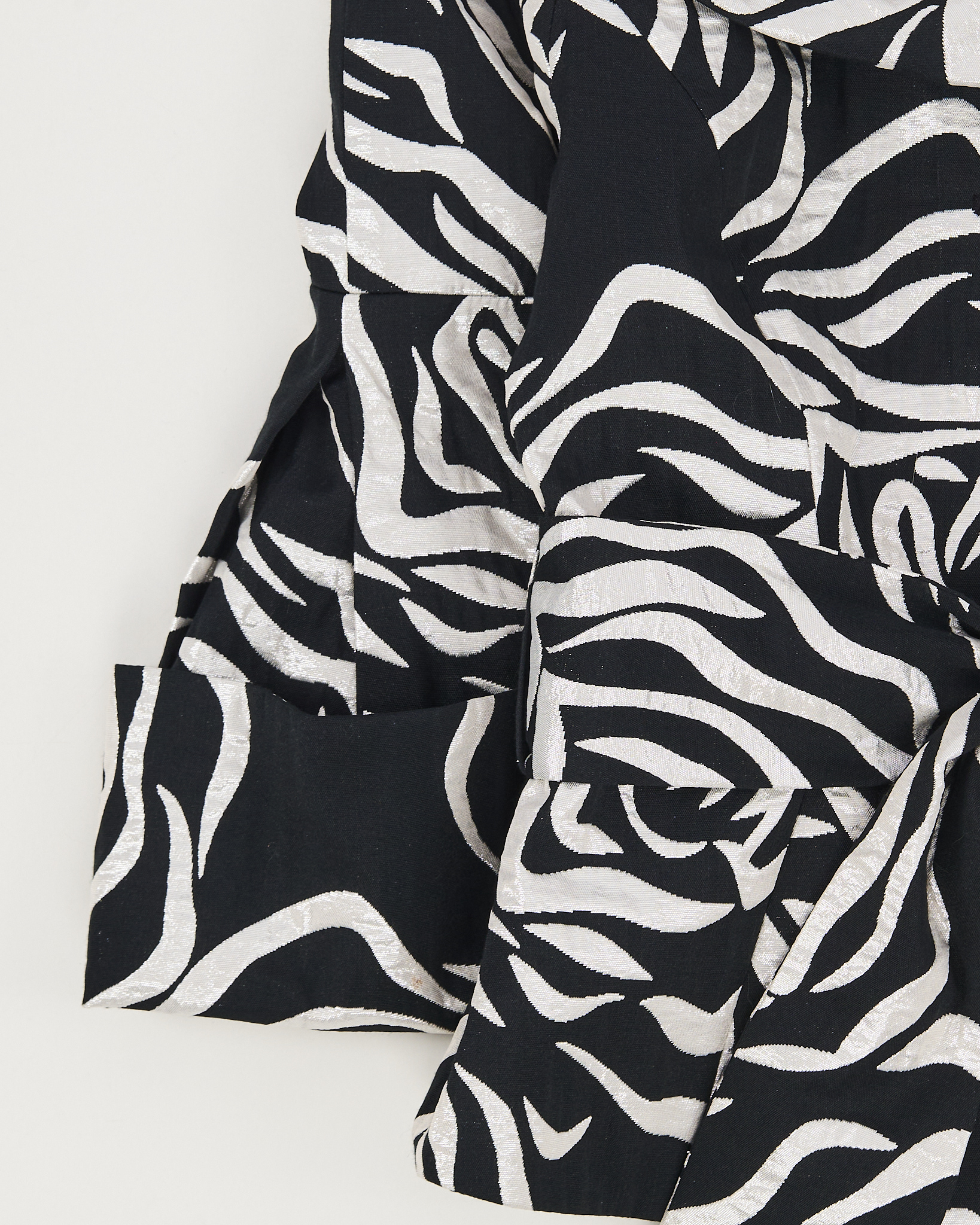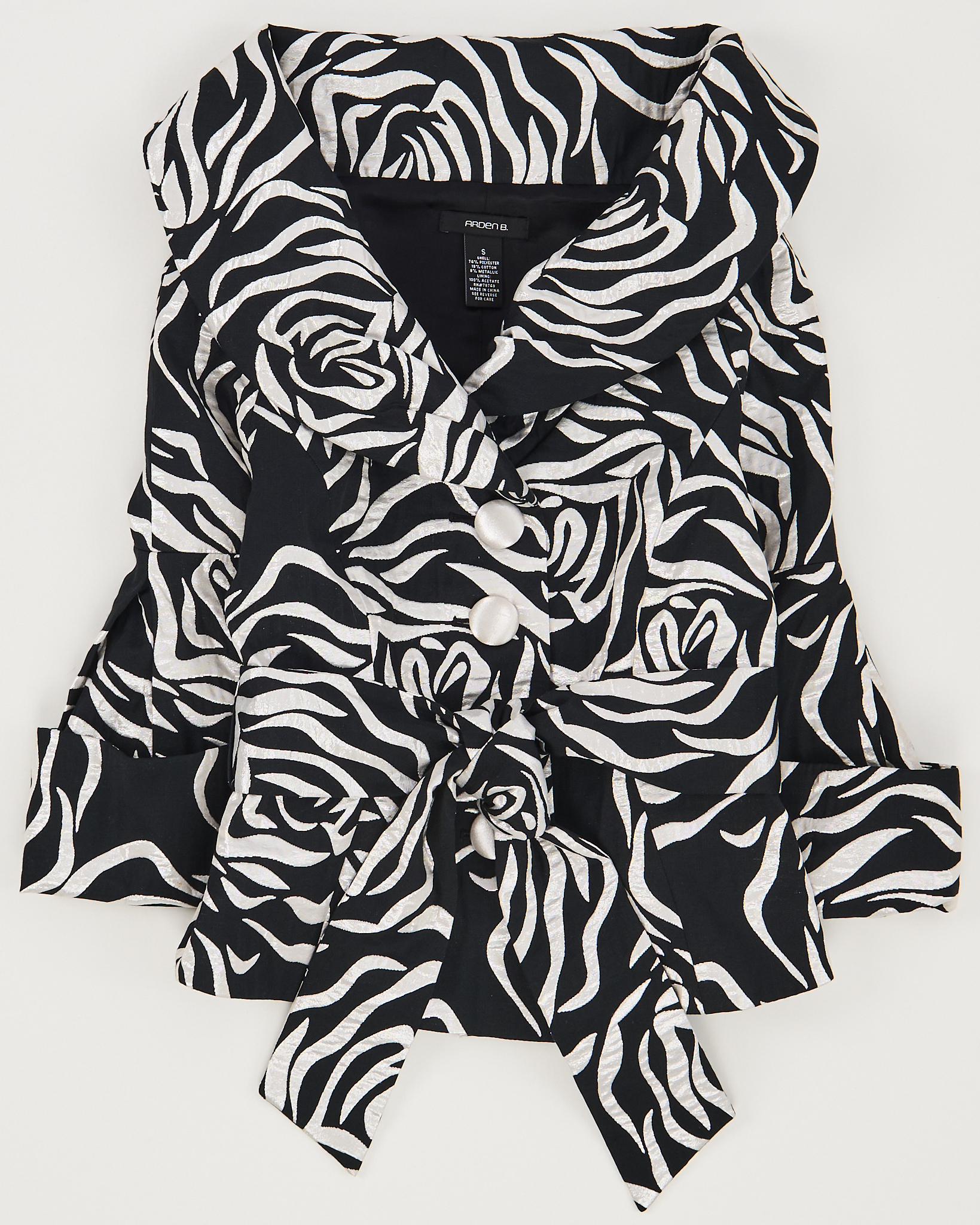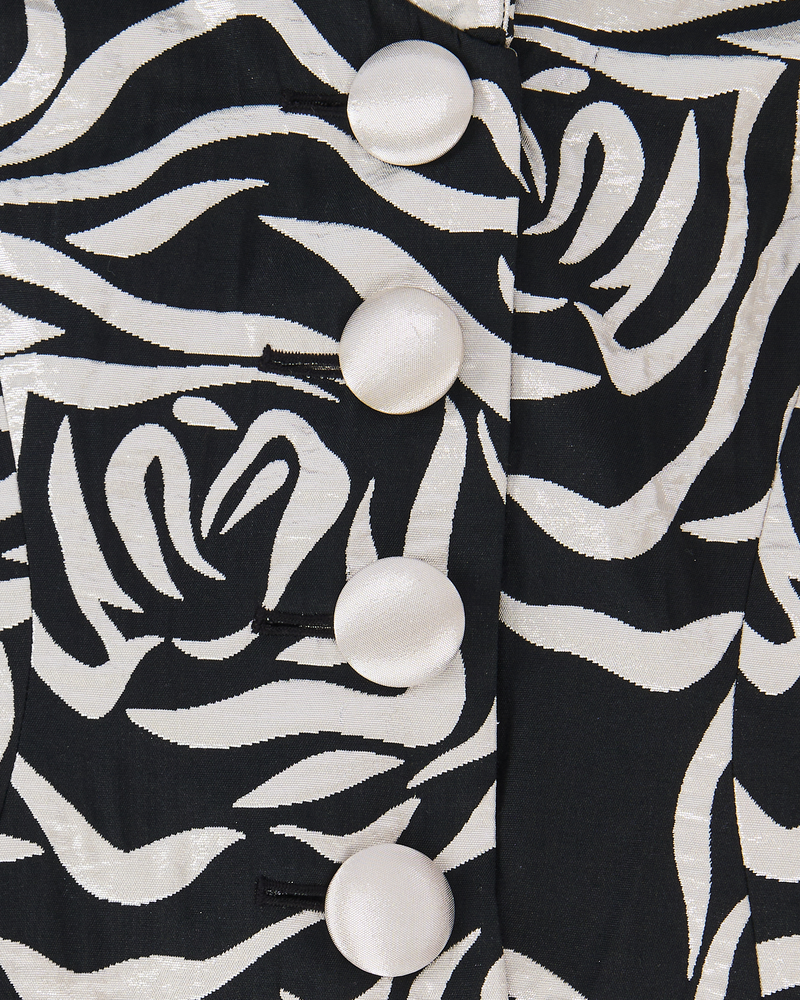 Укороченный жакет с выразительным рисунком в черно-белой гамме. Широкий ворот и крупные пуговицы - акцент модели. Широкий рукав 3/4