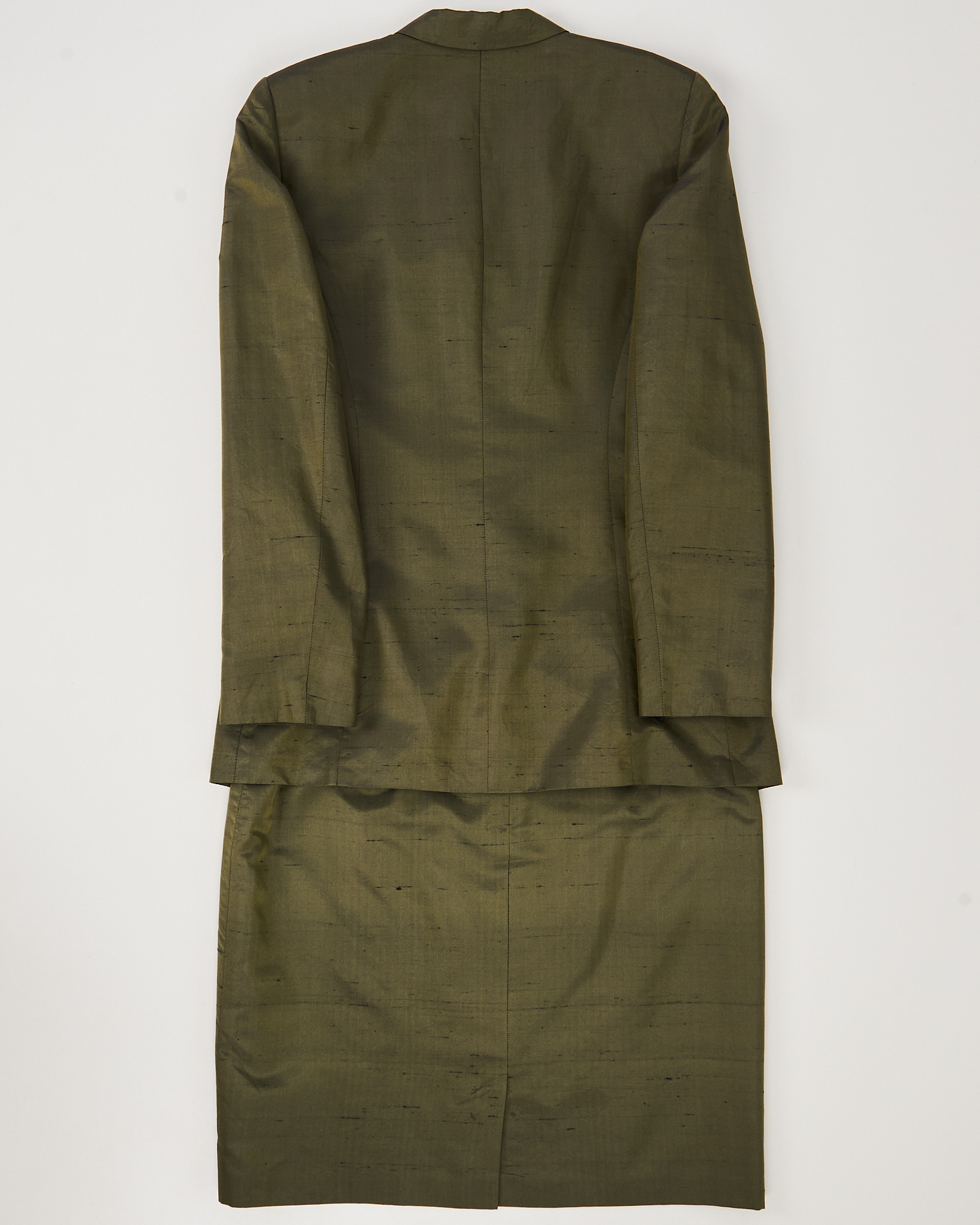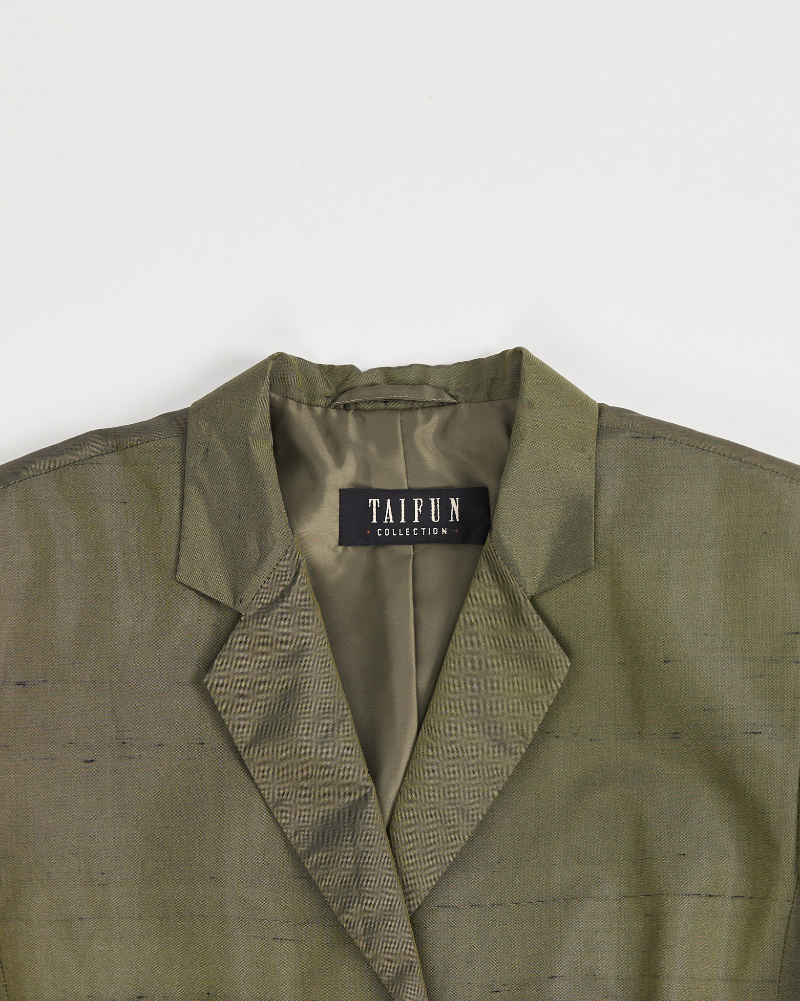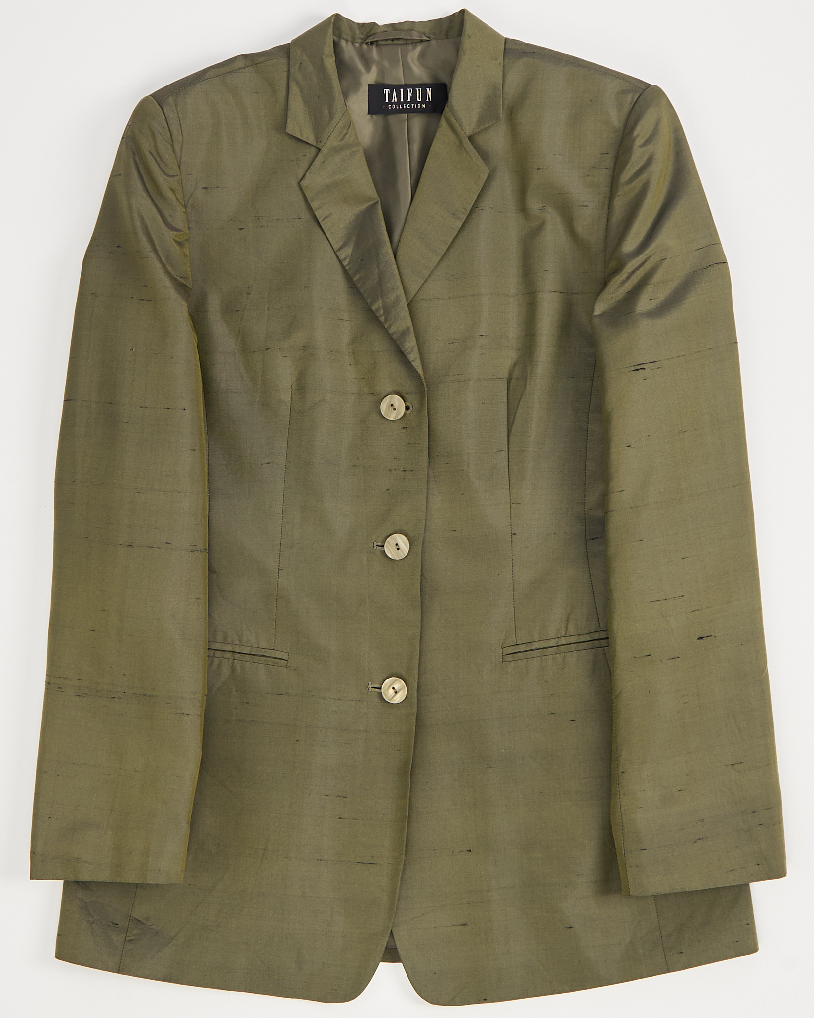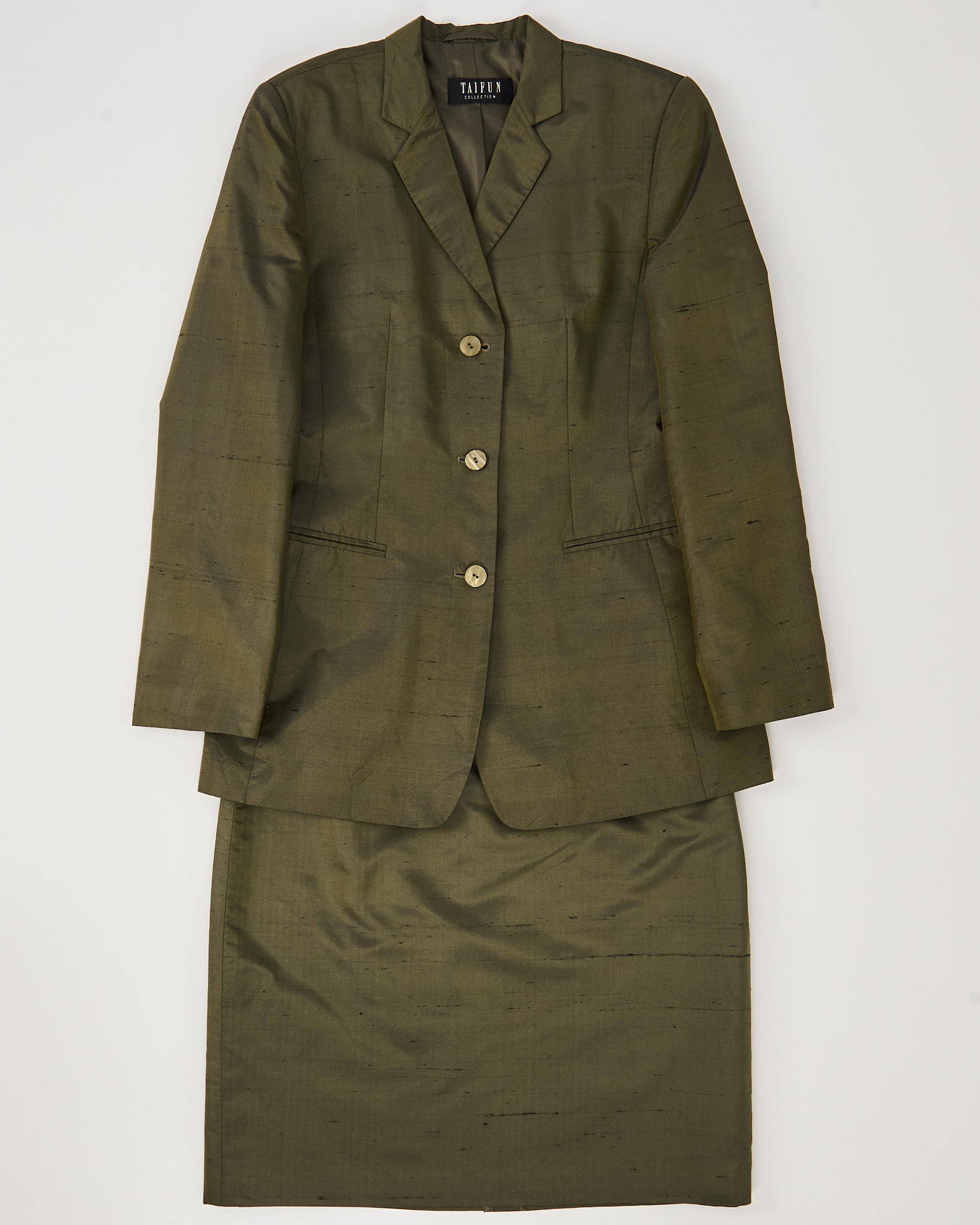 Костюм Taifun из натурального шелка. Жакет с прямой линией плеч создаёт чёткую посадку и аккуратный силуэт. Акцентные пуговицы, ткань- хамелеон с красивыми переливами. Юбка прямого кроя, удобная застежка на молнию, акцентная шлица сзади.