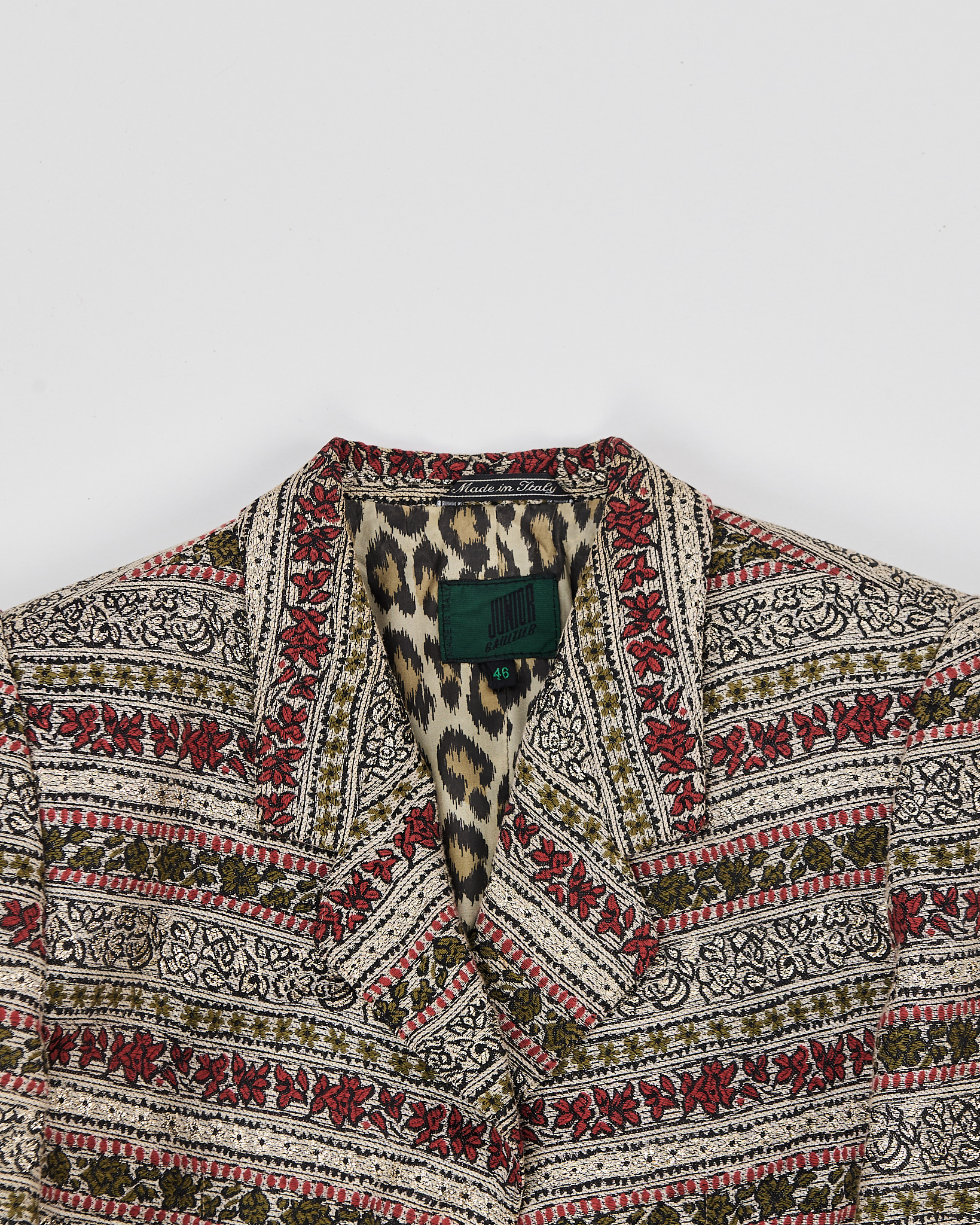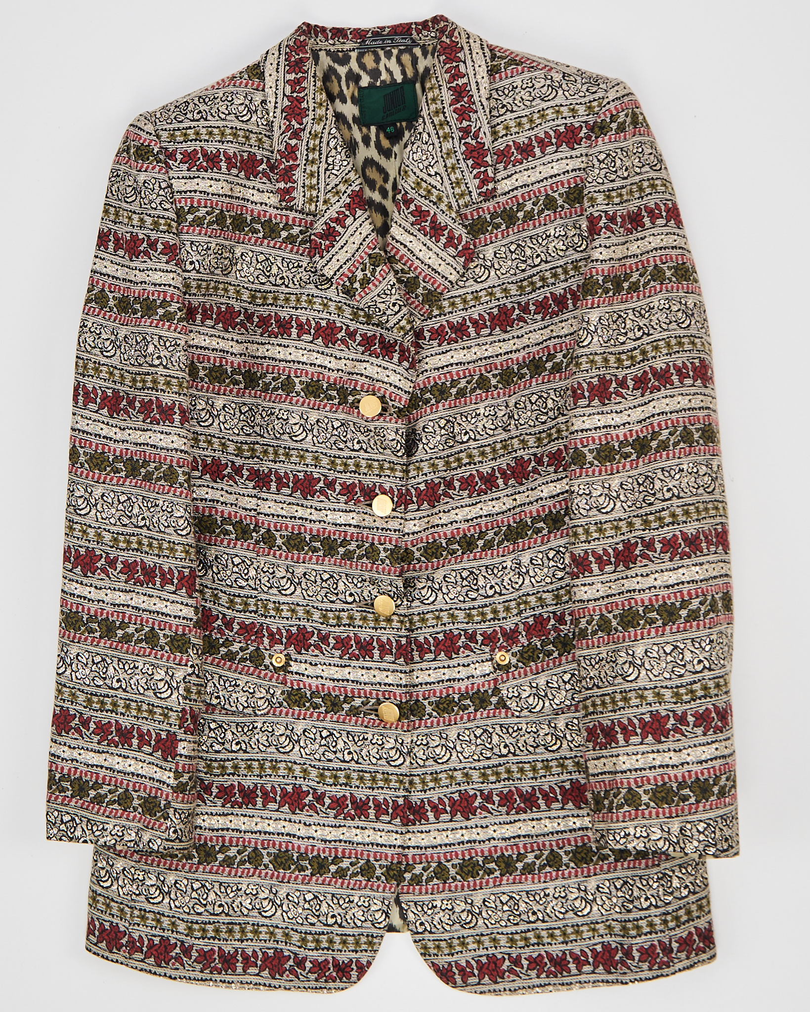 Жакет из плотного жаккарда с орнаментом и подкладкой с анималистичным принтом. Модель мягко садится по фигуре, сохраняя чёткую линию плеч и аккуратный силуэт. Золотистые пуговицы с тиснением.