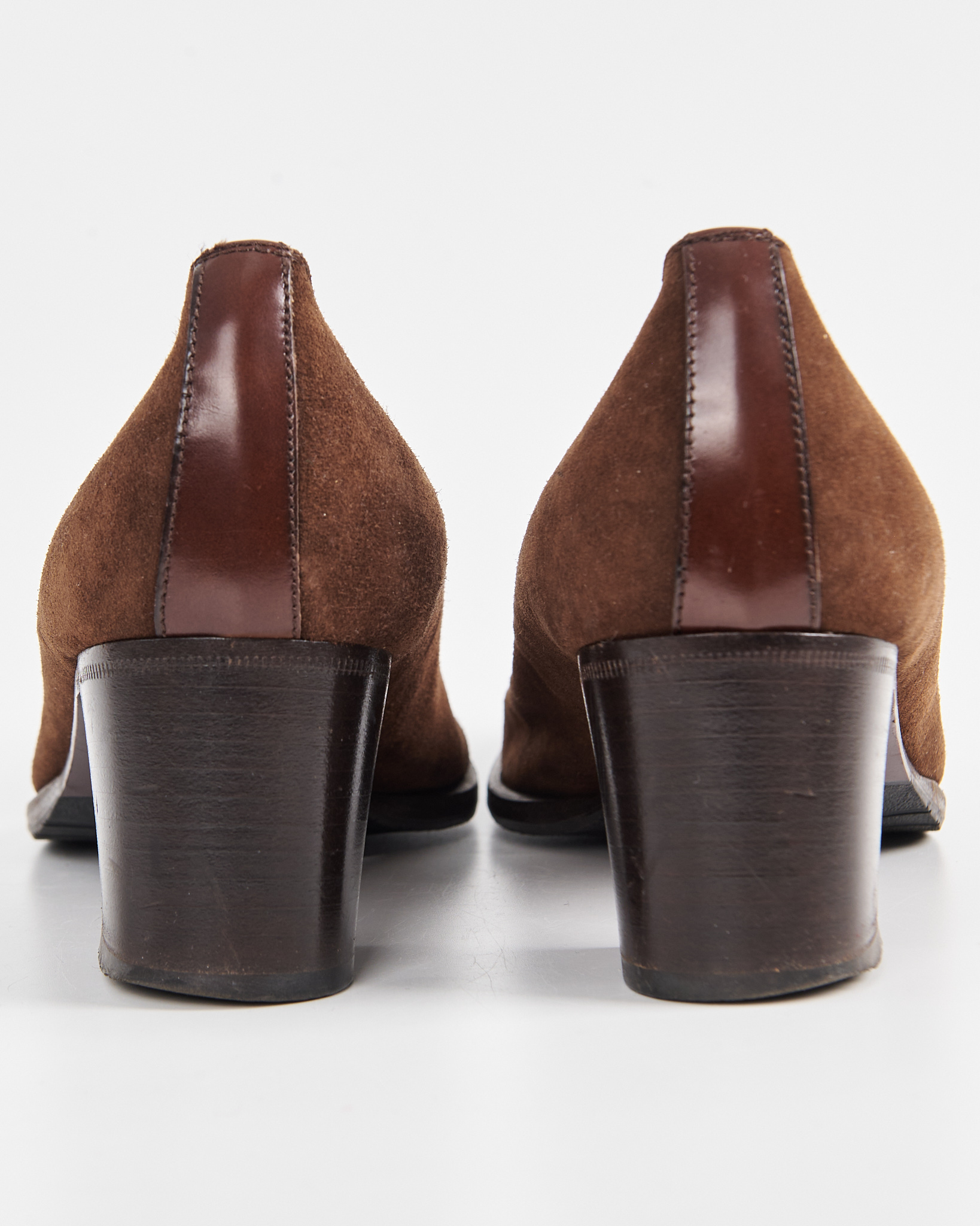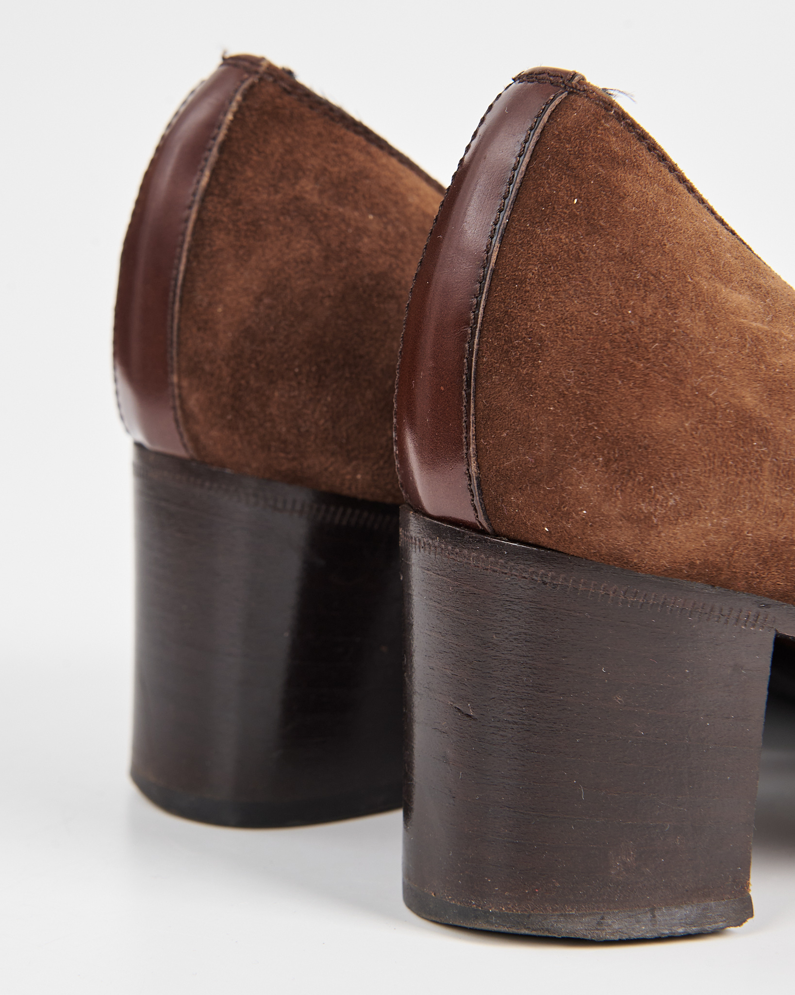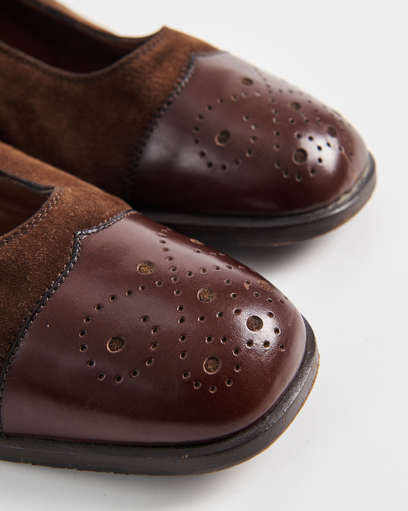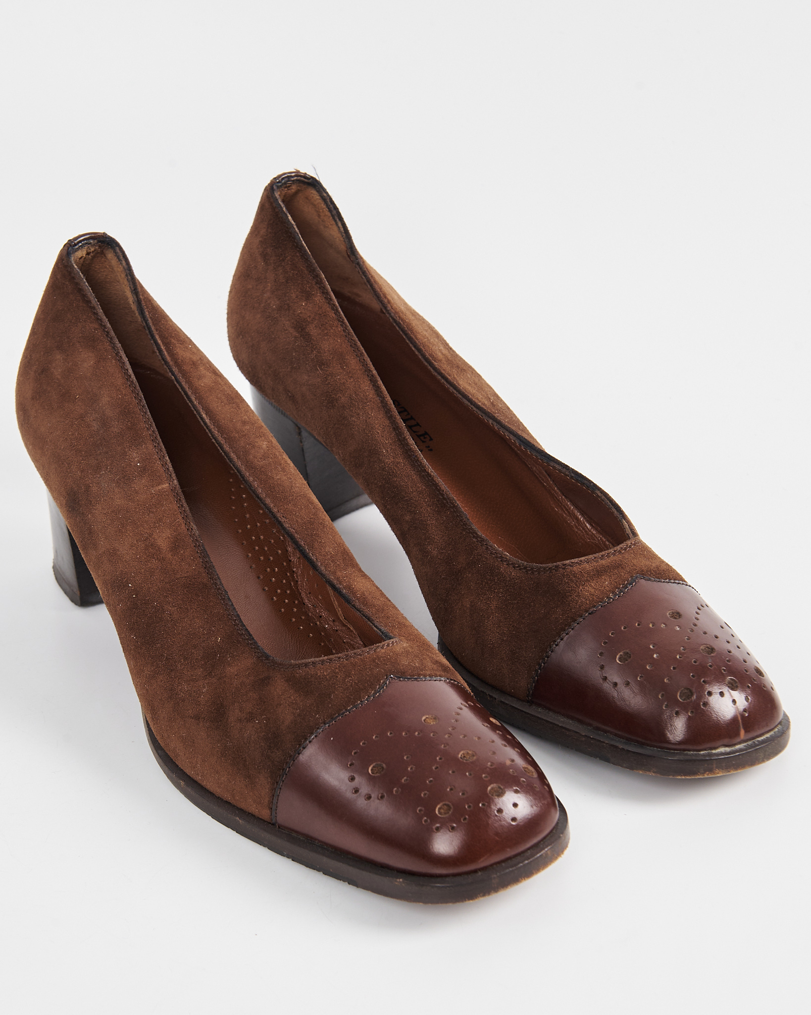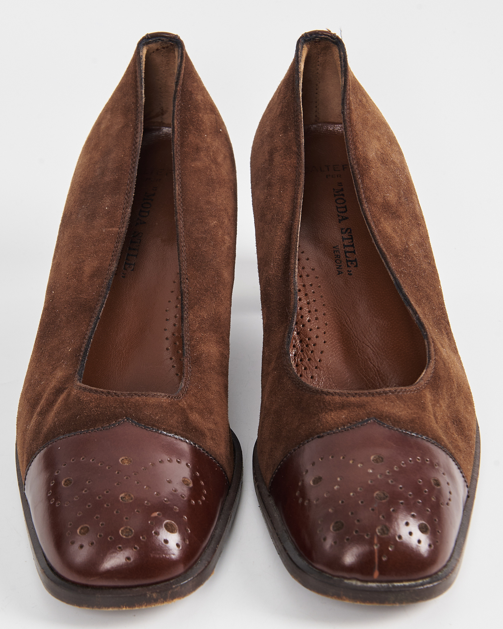 Элегантные винтажные туфли от итальянского бренда Moda Stile Verona. Выполнены из натуральной замши в сочетании с кожаными вставками. Классический дизайн с квадратным носком, украшенным перфорацией, придает обуви утонченность и стиль.