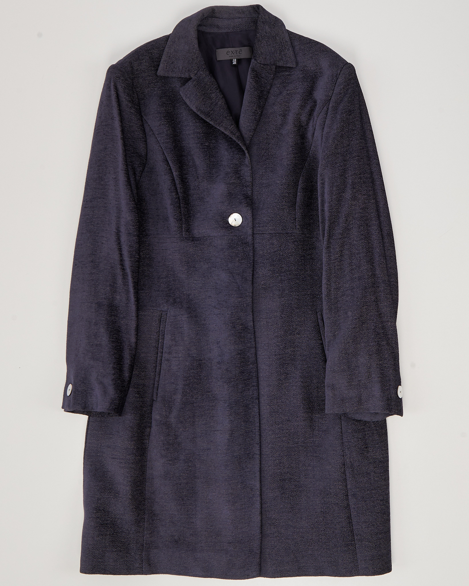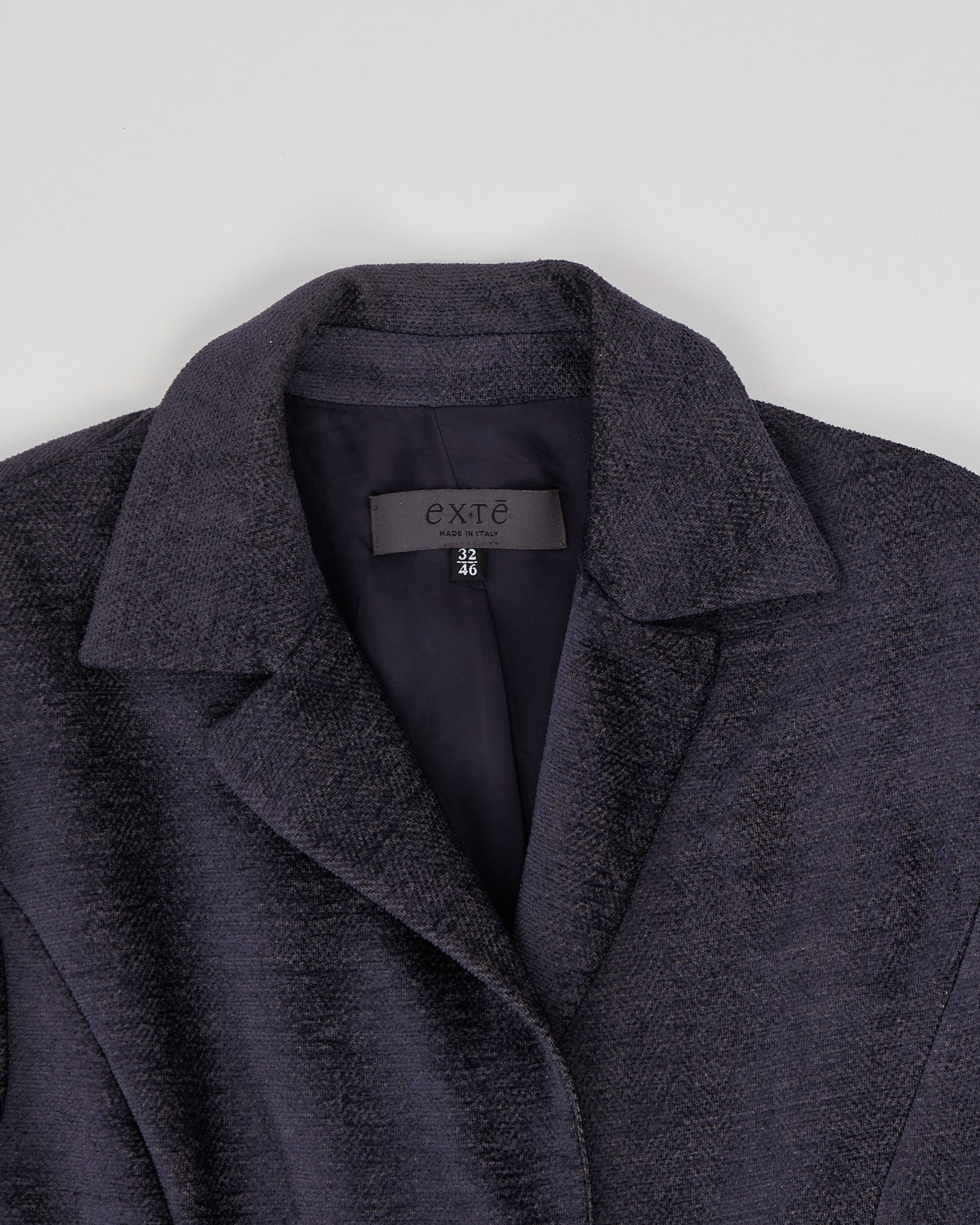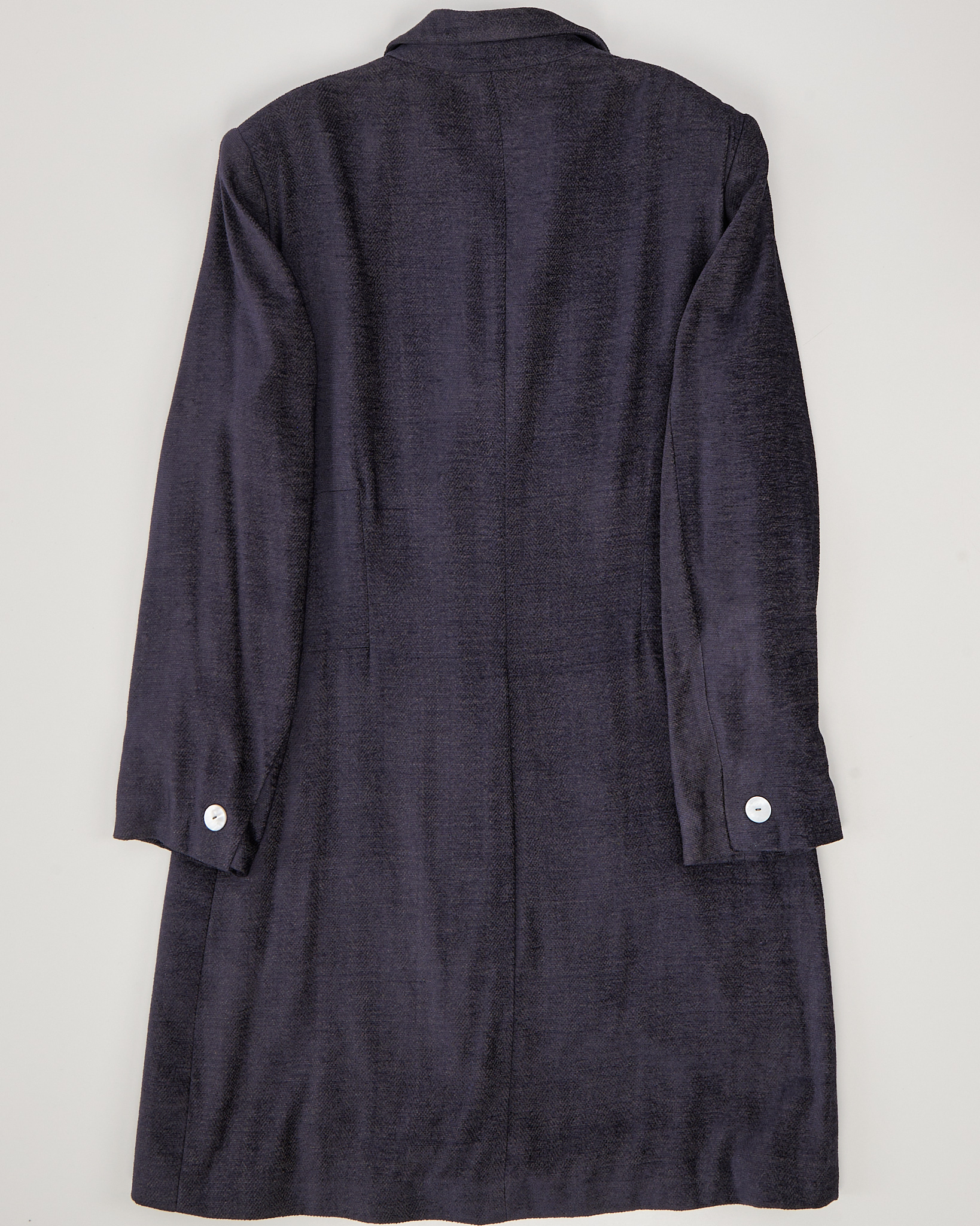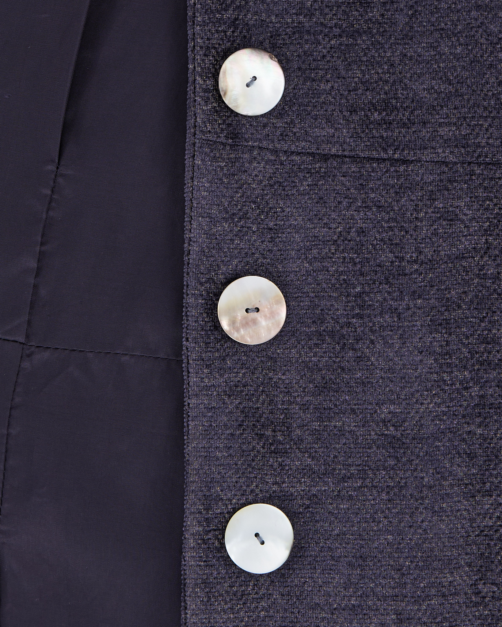 Велюровый жакет темно фиолетового цвета, с добавлением золотистых нитей, которые при попадании света выдают ненавязчивый золотистый блеск. Перламутровые пуговицы из натуральной ракушки